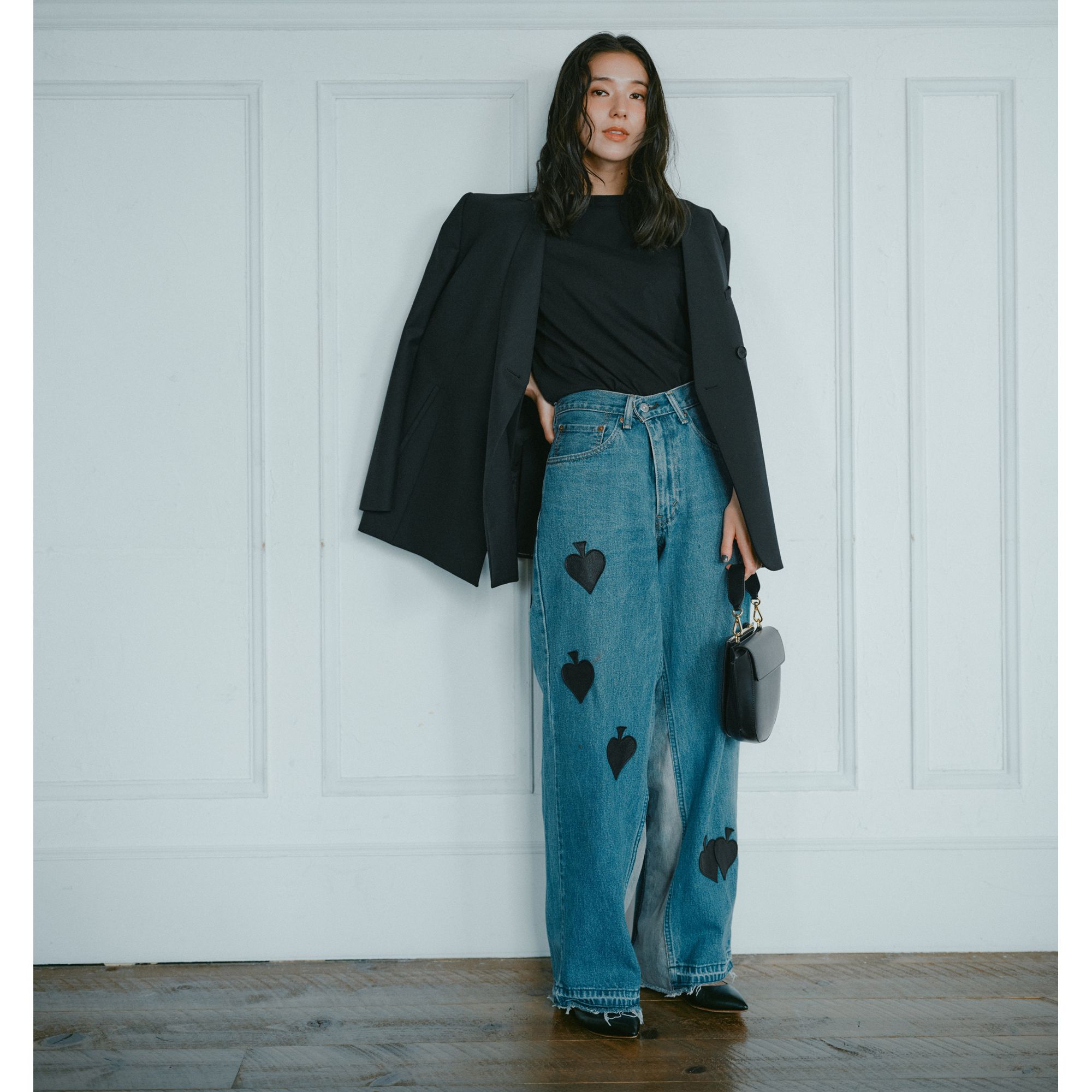 古着のテーパードデニムをベースに、内股に別布を足してワイドなバギーシルエットにリメイク。一点ごとに異なる色落ちや風合いが楽しめます。ブランドのアイコンであるスペードを逆さに配置したハート型レザーパッチデザインをあえて大人がサラッとはくのがクール。古着のLevi'550を使ったリメイクデニムだからこそ出せる自然なフェード感と、レザーパッチが唯一無二の主役デニム。デニムのキャッチーなデザインを引き立てるため、他のアイテムはブラックで統一してちょっとモードにはくのがかっこいい。内脇に別布を足してシルエットを大胆に調整。程よい広がりを持たせたバギーフィット.裾はカットオフ仕様.