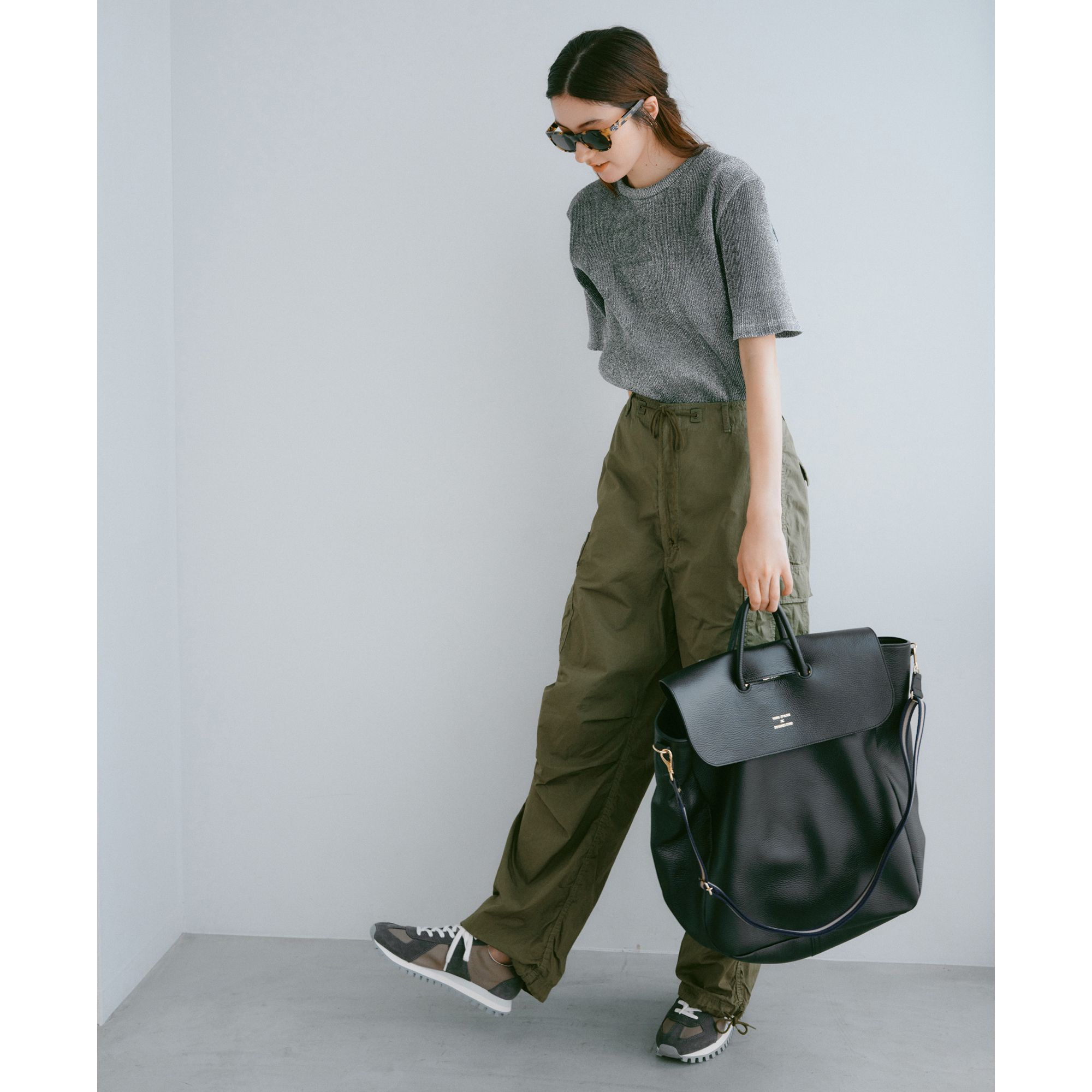 きちんと感のあるミラノリブ。ほどよいゆとりのストレートシルエット。もちろんスニーカーやサンダルでカジュアルにも。ウエスト内側のドローストリングスで調整できるのも重宝。ニットの落ち感でボリュームを抑えつつ、こなれ感もたっぷり。Sサイズの人がユルッとはいてももたつかず上品な分量。