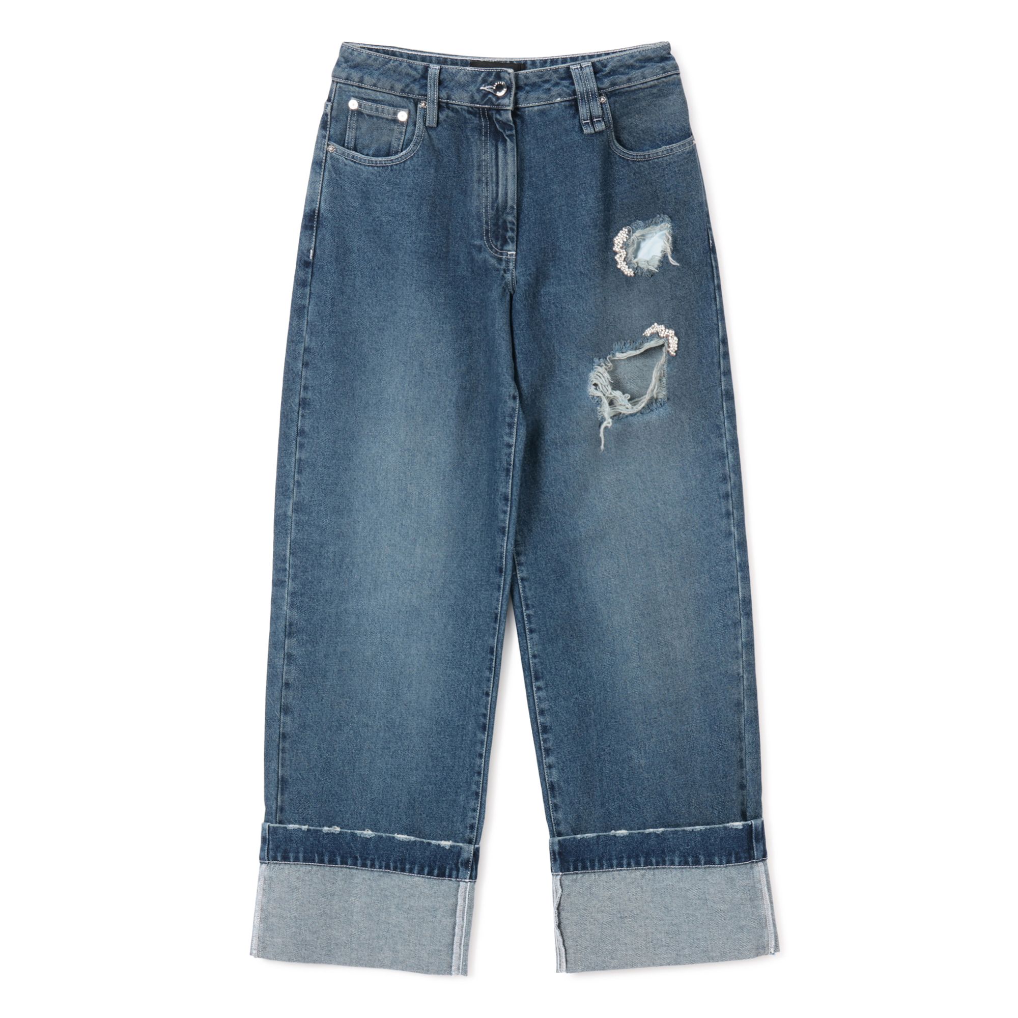 クラッシュ加工やフロントビジューが、一際キャッチーなボーイフレンドデニム。折り返した裾は縫い付けられているので、動き回ってもシルエットはキープ。パッチにも贅沢にフラワーモチーフのビジューをあしらい、女度アップ間違いなしの一本です。
