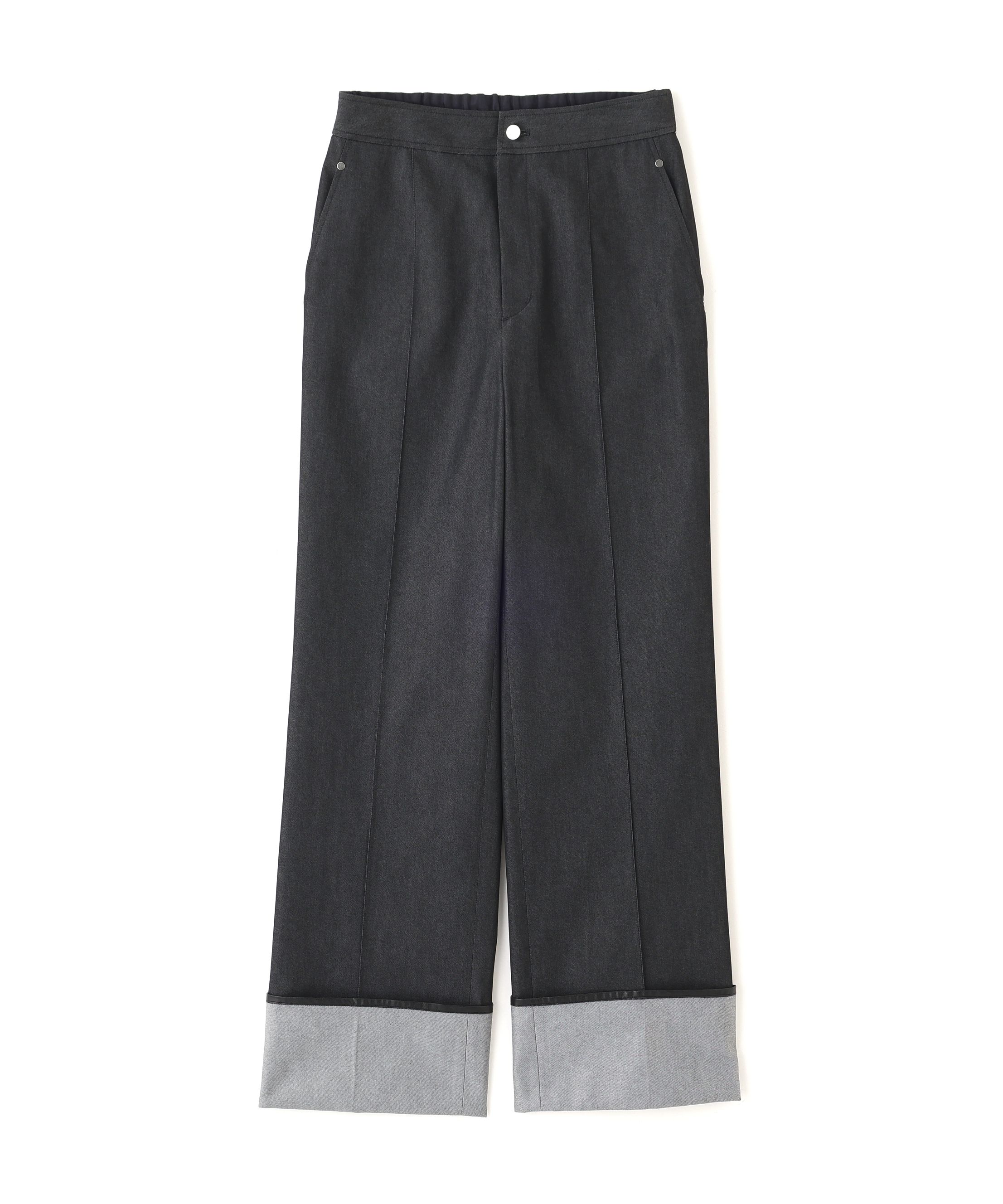 クールに織り上げたデニムライクな表情のストレッチパンツ裾をロールアップしたようなデザインのパンツで黒い合皮のパイピングがアクセントになっています。フラットでミニマムなカシメやリベット釦などデニムライクなディテールを随所に入れています。デニムの様な表情をポリエステルで、クールにスッキリと織りあげた伸縮性のある素材で仕立てました。※この商品は、ブラックのみ の1色展開となります。【商品特性】透け感:なし裏地:なし伸縮性:なし生地の厚さ:普通フィット感:普通おすすめ着用期間:春夏秋おすすめ着用シーン:休日透け感/なし|裏地/なし|光沢/なし|生地の厚さ/普通|伸縮性/なし|シルエット/スタンダード