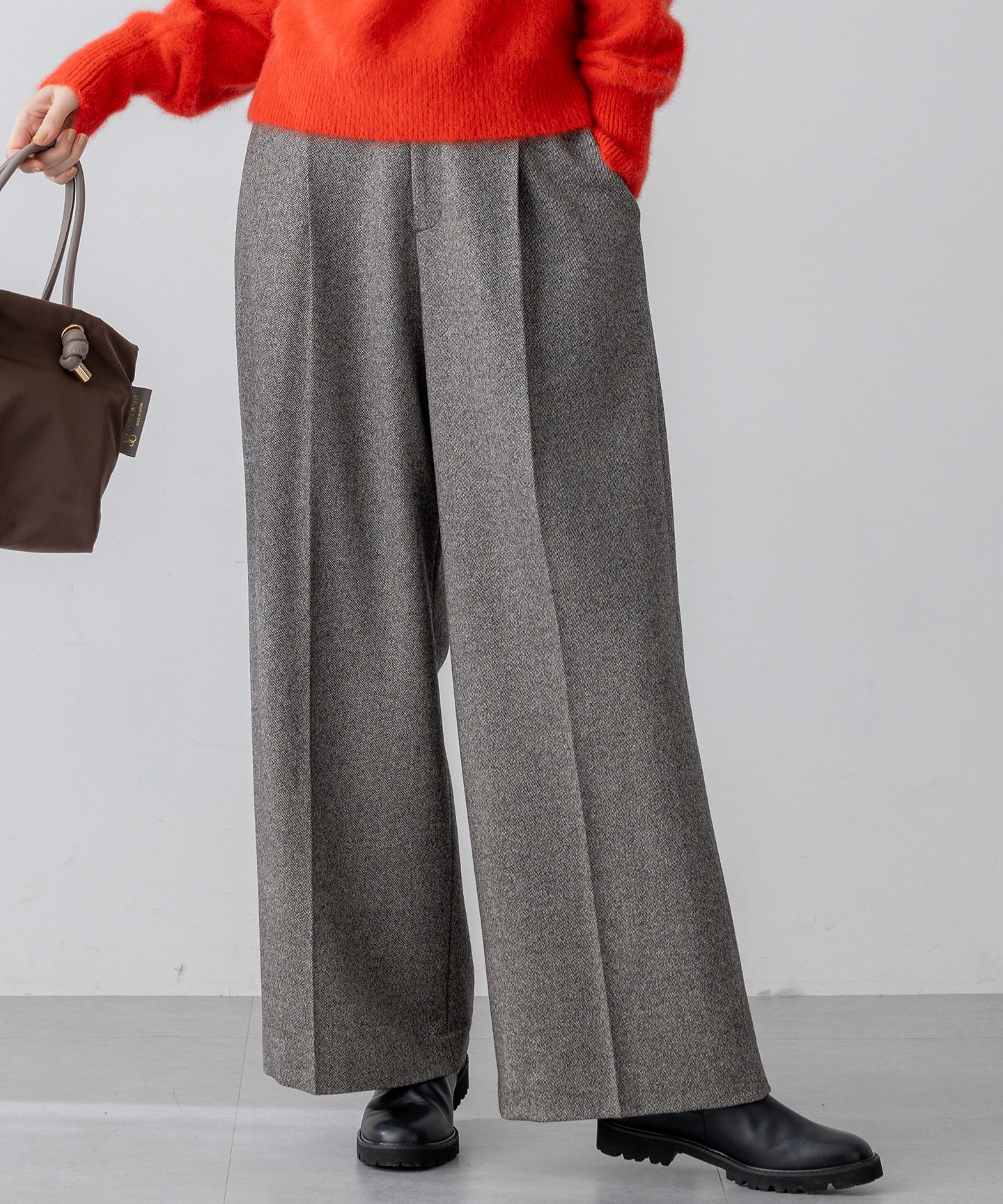 2025 Autumn & Winterラメと素材の上品さで着映えるワイドパンツ■デザインラメの入った素材感が印象的なタックワイドパンツ。ウエストにつけたタブはボタンを留める場所でサイズ調節が可能です。またデザインのアクセントにもなっており、トップスをインして着ても様になります。ウエストの後ろ部分はゴム仕様のため、穿きやすさもある1枚です。きれいに落ちるワイドシルエットが合わせを選ばず、様々なトップスと着合わせを楽しんでいただけます。カラーは、カジュアルスタイルに映えるモノトーン(#305)、印象を引き締めてくれるチャコール(#304)、やさしい雰囲気のベージュ(#333)の3色展開です。■素材素朴さのあるホームスパン素材に、微光沢感をプラスしてシックに仕上げました。さらにラメ混にすることで、エレガントさとトレンド感のあるツイード素材になります。独特のムラのある風合いを表現する為に、微光沢感のあるレーヨンにウールを巻き付けたタテ糸を使用。ヨコ糸にはウールとポリウレタンを使用してストレッチ性を出すことで穿き心地の良い素材に仕上げています。▼同シリーズラメミックスツイード ワンピース(品番:OPWOGW0517)ラメミックスツイード クロップド パンツ(品番:PRWOGW0517)※画像はサンプルを使用している為、実際にお届けする商品と仕様が異なる場合がございます。※サンプルはモデルサイズを使用している為、実際の商品のサイズはサイズ詳細の実測をご参照ください。
