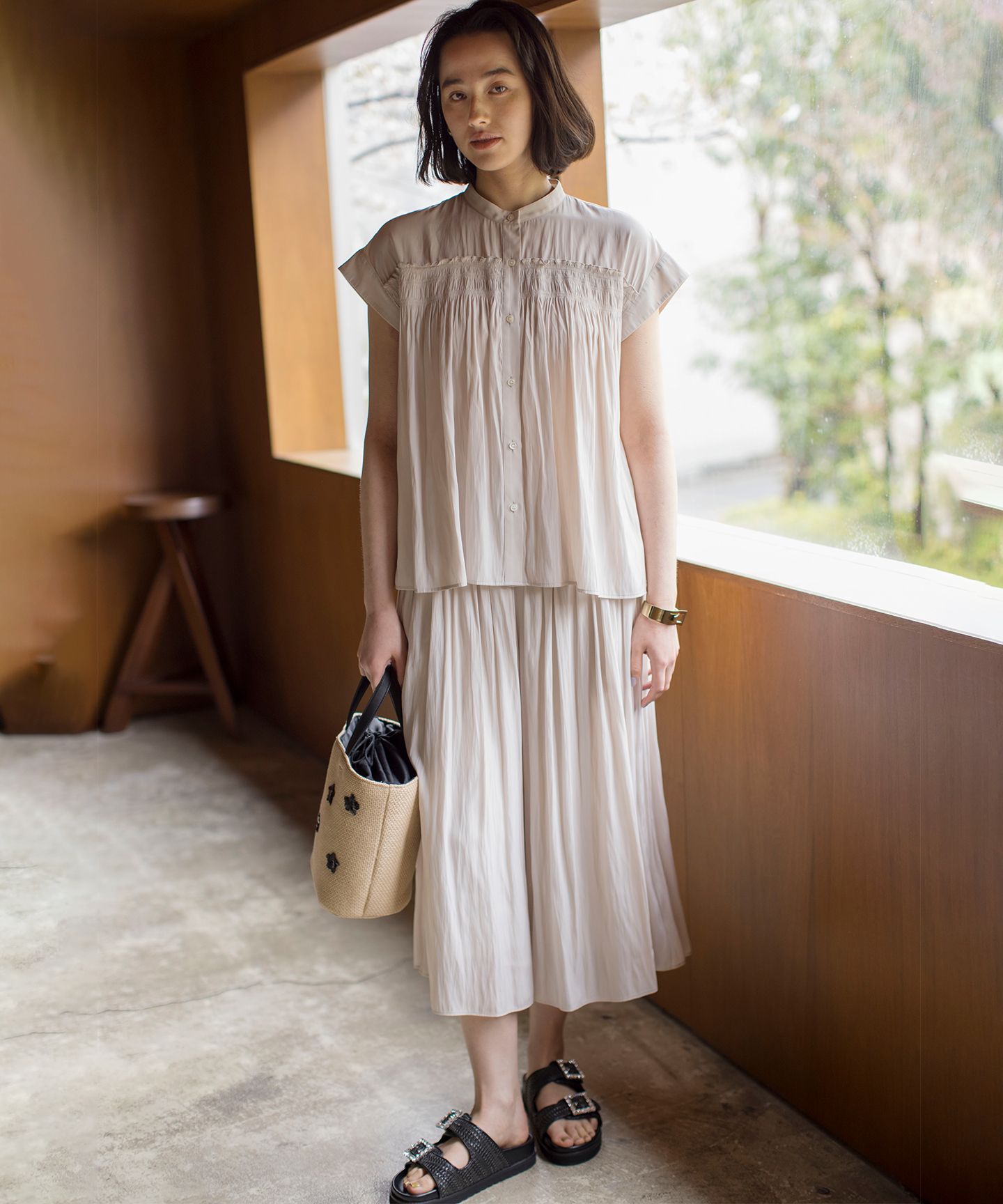 ■デザイン組曲定番のギャザーパンツ。スカート見えのパンツなので安心な着心地とウエストゴムのイージーなはき心地が嬉しいアイテムです。ウエスト内側は、ドロスト仕様になっているので共ヒモで、好みのウエストのサイズに調整できます。分量感のあるシルエットで、揺れ動くたびに女性らしさを演出。ギャザーがプリーツのようにタテに落ちてみえて上品な印象です。ポケット付きのデザインで使い勝手も◎。程よいカジュアル感はありながらも、さらっとしたキレイ目な素材感は、ゆったりとしたニットやカジュアルなアイテムと合わせてクラスアップに。落ち感のあるシルエットは、タックアウトのスタイリングでも重たく見えず、大人のリラクシースタイルがつくれます。■素材ギャザーを美しく表現する割繊糸を使用したデシン素材で程よい光沢と落ち感が特徴です。ビンテージ加工が施されているので、シワも気にならず着用いただけ、シーズンレスな素材感も嬉しいポイントです。コンパクトなカットソーやブラウスなどのキレイ目アイテムから、カジュアルな T シャツとも相性抜群の一枚あれば重宝するアイテムです。ご家庭で手洗いも可能で、シワにもなりにくく、おうち時間から通勤、旅行まで大活躍の万能ボトムス素材です。※画像はサンプルを使用しているため、実際にお届けする商品と色味やサイズ等の使用に変更がある場合がございます。予めご了承ください。