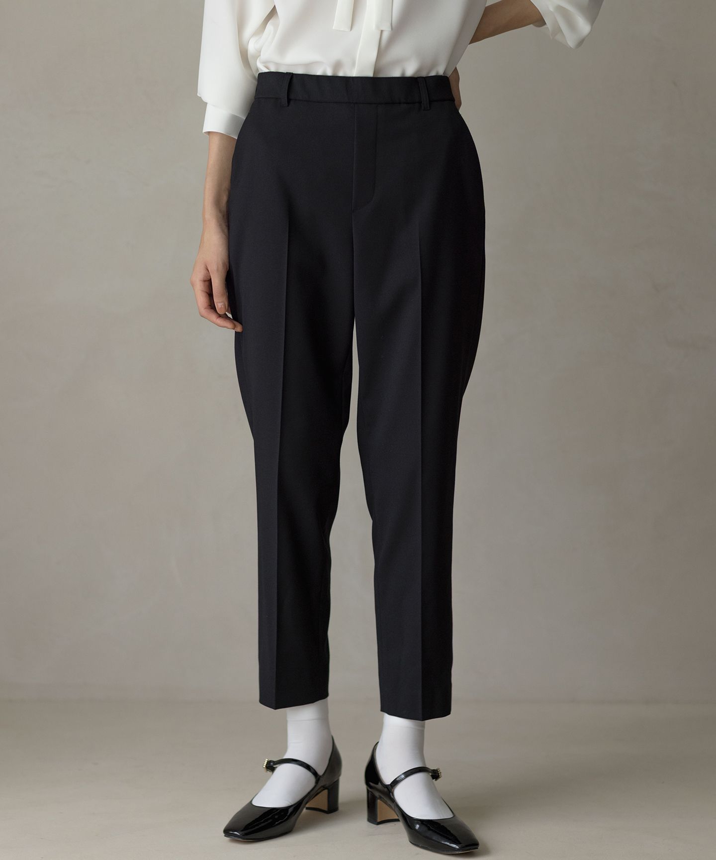 脚をよりまっすぐ美しく見せる、こだわりシルエットのテーパードパンツ■デザイン後ろウエストはゴム仕様ながらもフロントはフラットなヨーク見えできちんと感のあるデザイン。ストレスフリーなはき心地でありながら、センタープレスと緩やかに裾に向かって細くなったテーパードのシルエットがカジュアル感を抑え、すっきりとしたきれいな見た目を叶えます。ウエスト位置を高く上げて、脚をよりまっすぐにきれいに見えるようアップデートしました。ほどよく肉感のある素材を使用することで、体のラインを拾いにくいのも嬉しいポイントです。■素材二重織ならではの膨らみと程よい反発感、光沢とマット感が絶妙な繊細な表面感は、着用すると女性らしいやわらかさと上品な印象を与えてくれます。落ち感はありつつも、もたつきがなく絶妙なハリコシがある素材なので、重たさは感じにくいです。素材の肉感が適度に体形をカバーしてくれ、シーズンレス・シーンレスに活躍します。※撮影時の照明の関係により、実際よりも色味が違って見える場合があります。※商品の色味は、ハンガー吊り画像をご参照ください。※画像はサンプルを使用しているため、実際にお届けする商品と色味やサイズ等の使用に変更がある場合がございます。予めご了承ください。【お買い物をより楽しんで頂くために】▼商品のお気に入り登録ハートマークをクリックし、お好きなカラーを選んでお気に入りに登録が完了!完売カラーの再入荷通知や、ラスト1点の通知、セールの通知も受け取ることができます。▼ブランドのお気に入り登録新商品や再入荷等、いち早くブランドのお得な情報を受け取ることができます。※他のキャンペーンにより、期間中に価格が変動する場合があります。※セールは予告なく終了させていただく場合もあります