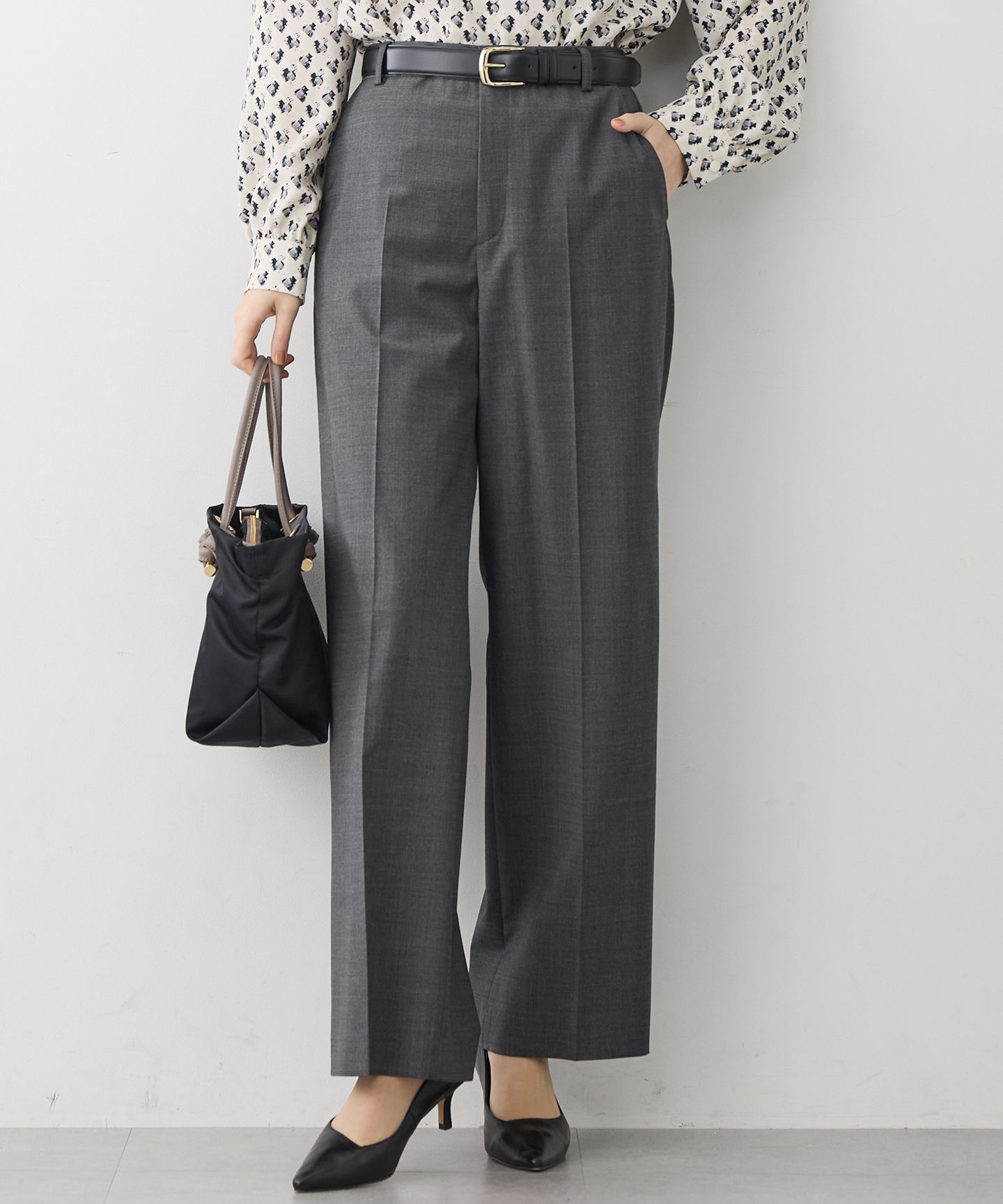 2026 Pre spring上質ウール仕立てで洗練された印象のスーツパンツ■デザインすっきりとしたワイド過ぎない上品なシルエットが特徴のパンツです。センタープレスが縦のラインを強調してくれます。裏地のない一枚仕立てのため、軽やかな穿き心地で、季節を問わず快適に着用いただけます。 同素材のジャケットと合わせれば、通勤やセレモニーシーンにふさわしい洗練されたセットアップスタイルが完成します。また、単品使いでもきれいめスタイルとして、デイリーにも活躍する一本です。カラーは、着回し力抜群のベーシックなブラック(#005)、濃紺寄りの深いネイビーストライプ(#175)、洗練された都会的な雰囲気を醸し出すグレー(#004)の3色展開です。■素材ウールの中でも、上質なスーパー120sウールを贅沢に使用した素材です。非常に細くしなやかな繊維が織りなす、滑らかな肌触りと、ウールならではの暖かみが魅力です。さらに、特殊なチンツ加工を施すことで、控えめながらも上品な光沢感をプラス。23区オリジナルの特別な生地に仕上げました。ストレッチ性も兼ね備えているため、長時間の着用でもストレスを感じにくく、快適な着心地をお楽しみいただけます。▼同シリーズファインネスウール 一つ釦 ジャケット (品番:JKWOLS0005)ファインネスウール 二つ釦 ジャケット(品番:JKWOLS0006)ファインネスウール フレア スカート(品番:SKWOLS0005)ファインネスウール テーパードパンツ(品番:PRWOLS0005)※画像はサンプルを使用している為、実際にお届けする商品と仕様が異なる場合がございます。※サンプルはモデルサイズを使用している為、実際の商品のサイズはサイズ詳細の実測をご参照ください。