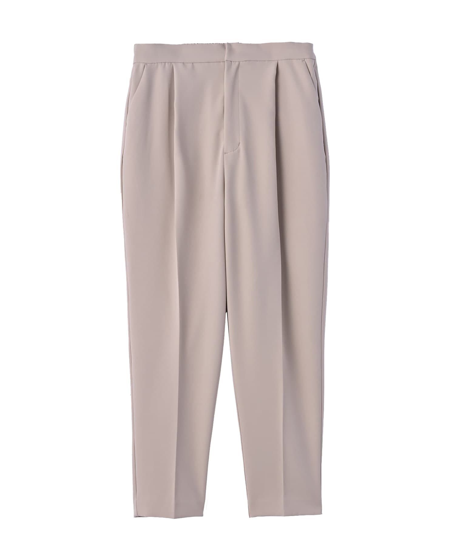 美脚に導くフロントタックとセンタープレスがポイント。ウエストは後ろゴムの仕様なので着用感は締め付け感はなく、サイズ的にも幅広く対応可能です。素材は僅かな凹凸があり、綺麗な落ち感がでるので上品な見え感で伸縮性もあるので動きやすい。単品でカジュアルにも着用できますが同素材でトップスもあるのでセットアップで着用いただいてオケージョンにもおすすめ。【オススメのシーン】デイリーにはもちろん、オフィスコーデにもちょっとした行事にも最適です◎セレモニーやオケージョンなどにも使えます。【商品について】◆着用時期:通年◆サイズ感:ウエストは後ろゴム、程よいゆとり感◆丈感:フルレングス◆シルエット:裾に向かって細くなるシルエット、センタープレス有り◆タック:前ウエスト下に有り◆ウエスト:後ろゴム◆厚み:中肉◆柔らかさ:程よいハリ感◆光沢感:無し◆着用シワ:折りシワ有り(気にならない程度。スチーマーでサッと伸ばせる扱いやすい生地)。◆伸縮性:有り◆ファスナー:フロントに有り◆ポケット:有り◆裏地:無し◆手洗い:可能◆裾上げ:可能◆アイロン:可能【お色について】◆ブラック:通常の定番ブラックです。◆アイボリー:肌馴染みが良く、暖かみのあるバニラのようなホワイト系カラー。◆グレー:僅かにグリーン味が入ったお色。