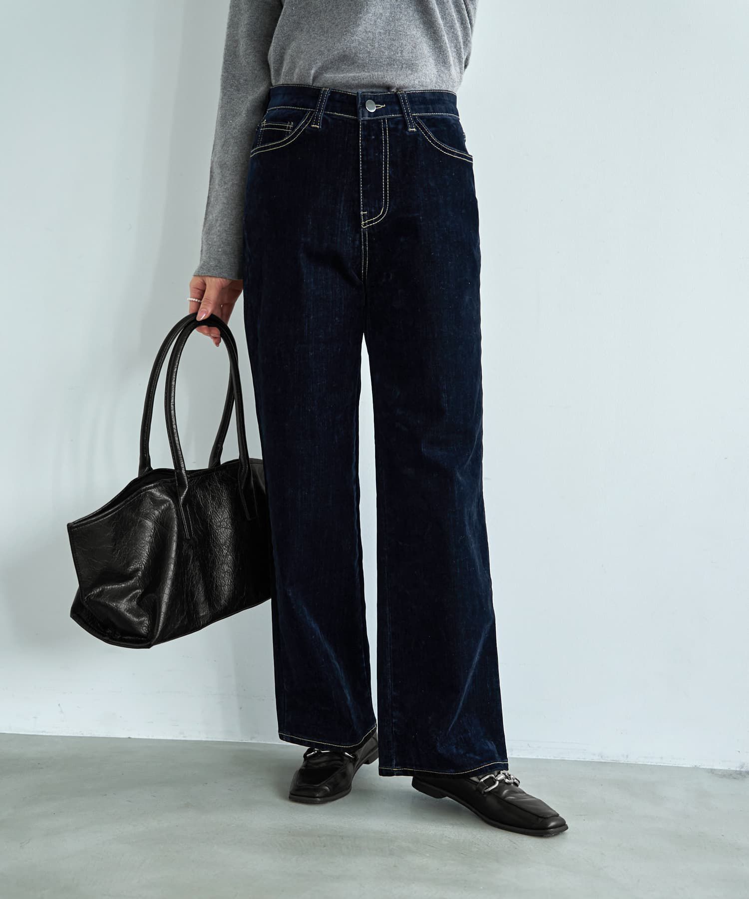ベルベット生地のウエストゴム内蔵型デニムカッコ良さと着痩せ効果、ラクな穿き心地が揃った新感覚デニム。表面はベルベット、裏面はサラりとしたコットンパンツのような質感という、最新の生地を使用しています。ウエストには全周でゴムが内蔵されており、素材自体も強いストレッチ性あり。染料の色味が深く入る、ベルベット生地ならではの美しいネイビーの発色もまた魅力。濃い色の引き締め効果と優れたパターンによる秀逸フォルムで、真っ直ぐな美脚見えも叶います。◆フォルム:直線、という感じで脚を真っ直ぐに見せる、ワイド幅のストレートです。◆色味:深いネイビーに、ベルベット特有のたまに感じるツヤ感が色味に奥行きを与える、とてもキレイで魅惑的なお色です。◆生地伸び:生地自体にはハリ感があるため、穿いているうちに伸びてしまうことや膝が伸びる感じはありません。普通のデニム同様、多少は緩くなります。◆お手入れ:素材的に手洗いは可能ですが、洗うことで染料が溶け出し、表面に色ムラや色味の変化がおきる可能性があります。質感や色合いの維持を優先する場合は、普段は洗わずに消臭・殺菌をスチーマーで済ませ、たまにクリーニングに出すのがお薦めです。◆丈感:一般的なフルレングスデニムです。普通身長(158-163cm)でブーツを穿いてちょうど良い感じ。153cmだと同じブーツで裾が床に着く感じなので、3-4cm程度の丈詰めをするのが良さそうです。170cmの方には少し短く、169cmまでならスニーカー合わせでベストになるイメージです。ゴム入りなので少し腰に落として穿くこともでき、高身長な方にはそれもカッコ良くてお薦めですし、丈感的な余裕も出てきます。【お知らせ事項】◆こちらの商品は濃いお色のベルベット製品なので、色落ち・色移りが生じることがございます。◆水分があるとそのリスクが高まりますので、雨の日や湿度、汗やムレがある際はとくにご注意ください。◆白いバッグやスニーカー、明るい色の下着やトップスなど、色が移って困るような明るいお色のアイテム合わせは避けるのが良いと思います。◆体温で湿度が生まれますので、明るい色の椅子やソファ、車のシートなどにも配慮が必要です。◆インディゴなどのデニム同様、色落ちのリスクは経年と共に落ち着いていきます。【その他の仕様】◆着用時期:10-4月頃が目安◆サイズ感:ゆったりめ◆シルエット:ワイドストレート◆ウエスト:(内側)全周ゴム仕様◆ベルトループ:あり◆厚み:普通のデニムよりはやや厚め◆柔らかさ:ハリ感+強い柔軟性◆肌触り:サラッとした感じ◆着用ジワ:できにくい◆毛羽立ち:できにくい◆伸縮性:あり◆光沢感:光の加減でたまに微光沢◆透け感:なし◆ボタンの色:シルバー◆ステッチの色:ベージュ◆スリット:なし◆着脱:フロントファスナー+ボタン◆ポケット:両サイドとヒップ左右にあり◆裏地:なし◆手洗い:可能(できればクリーニング推奨)◆裾上げ:お直しに出していただけます◆アイロン:不要◆スチーマー:使用OK