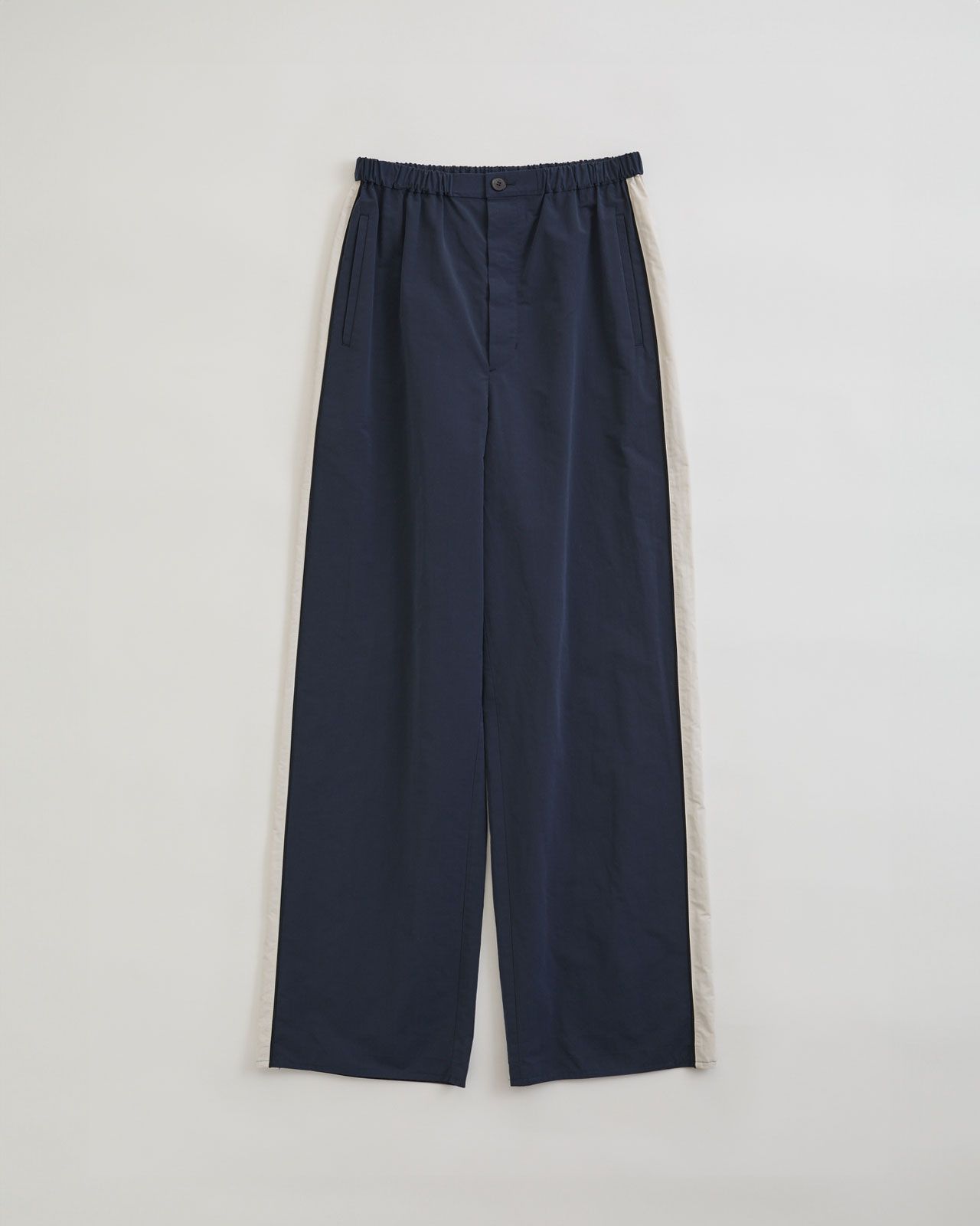 サイドライン入りで脚をすらっと見せるスポーティなトラックパンツ。目の詰まった生地はスエードのように滑らかで品よく、ヴィンテージライクなこなれ感もあって、上質なニットを無造作に合わせるだけでも決まります。ポリエステルナイロンの割繊糸を高密度に織り上げた生地を使用しました。まるでスエードのような、なめらかでビンテージ感のある風合いが特徴的。袖下にマチを入れたボリュームのあるシルエットは、パンツスタイルはもちろん、ドレスと合わせてもグッドバランス。