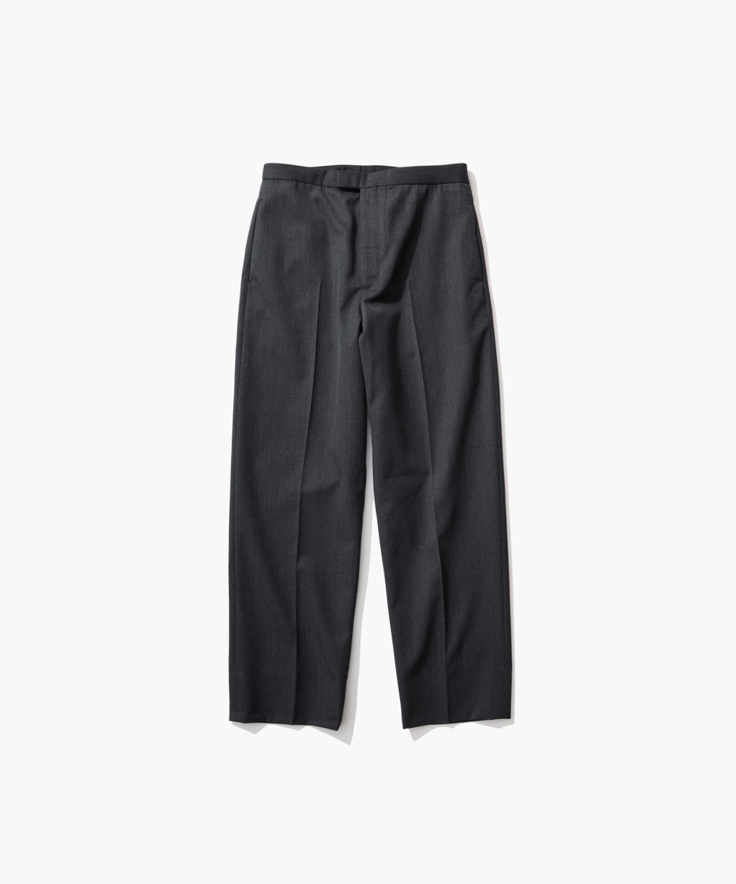 ■DESIGN1タックの入ったテーパードシルエットのパンツ。サイドベルトが後ろまで通っている仕様なので、寸法調整した時にヒップに分量が溜まり横張したシルエットに見えてしまうデメリットも解消されます。バックルではなくタックボタンのディティールで、よくあるミリタリー感もなく、すっきりした印象です。ATON定番パンツよりウエスト設定を大きくしているので、腰で落として履くこともできます。■MATERIAL先染めのSUPER100sウール糸を、岐阜羽島市でゆっくりと丁寧に織られた素材です。通常のウールギャバンジン素材とは異なり、糸の打ち込み本数を限界の多さで織り込んでいるのと、特殊な仕上げ加工により、シルク混素材のような艶と落ち感が特長の、ATONオリジナル素材です。