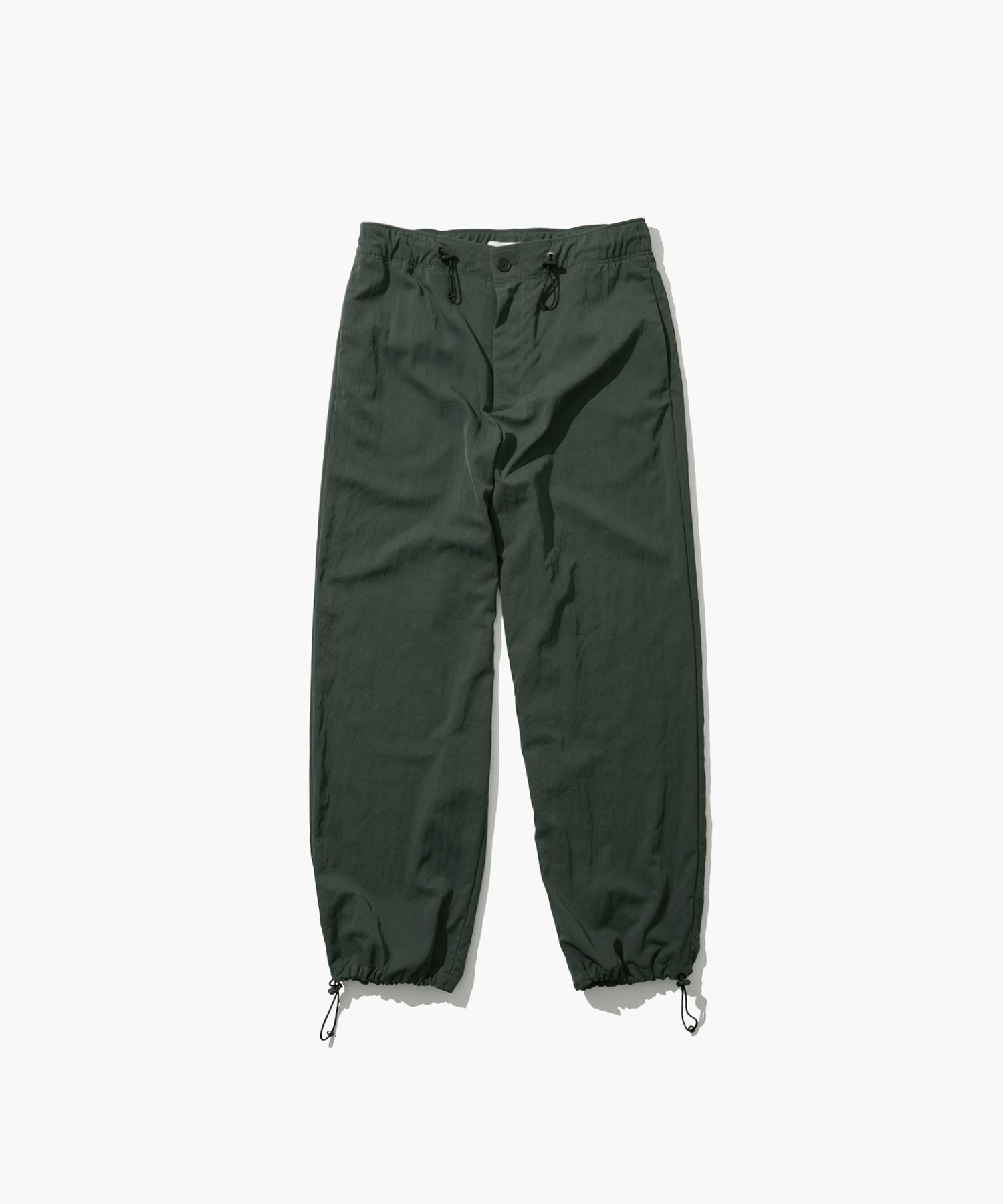 ■DESIGN古着のカーゴパンツの迫力あるワイドストレートシルエットをベースにしたパンツです。フロントと裾に2つずつある外だしのアジャスターで、サイズを調整して着用するイージーなデザインが特徴です。裾のスピンドルを絞ることで、また違ったシルエットを楽しめます。シワになりづらいので持ち運びにも便利で、速乾性もありイージーケアです。■MATRIALタテに強撚のナイロン糸、ヨコに特殊なタスラン糸を用いて、福井市で織り上げたツイル素材です。タテ糸の強撚からくるサラッとしたタッチと、梳毛のウールのようなドレープ感、ヨコ糸のタスラン糸からくる天然繊維のような膨らみとハリコシを持ち合わせた、糸と打ち込みから設計したオリジナル素材です。軽い撥水性も持ち合わせています。HIGH TWIST NYLON | ハリントンジャケットHIGH TWIST NYLON | ショーツ