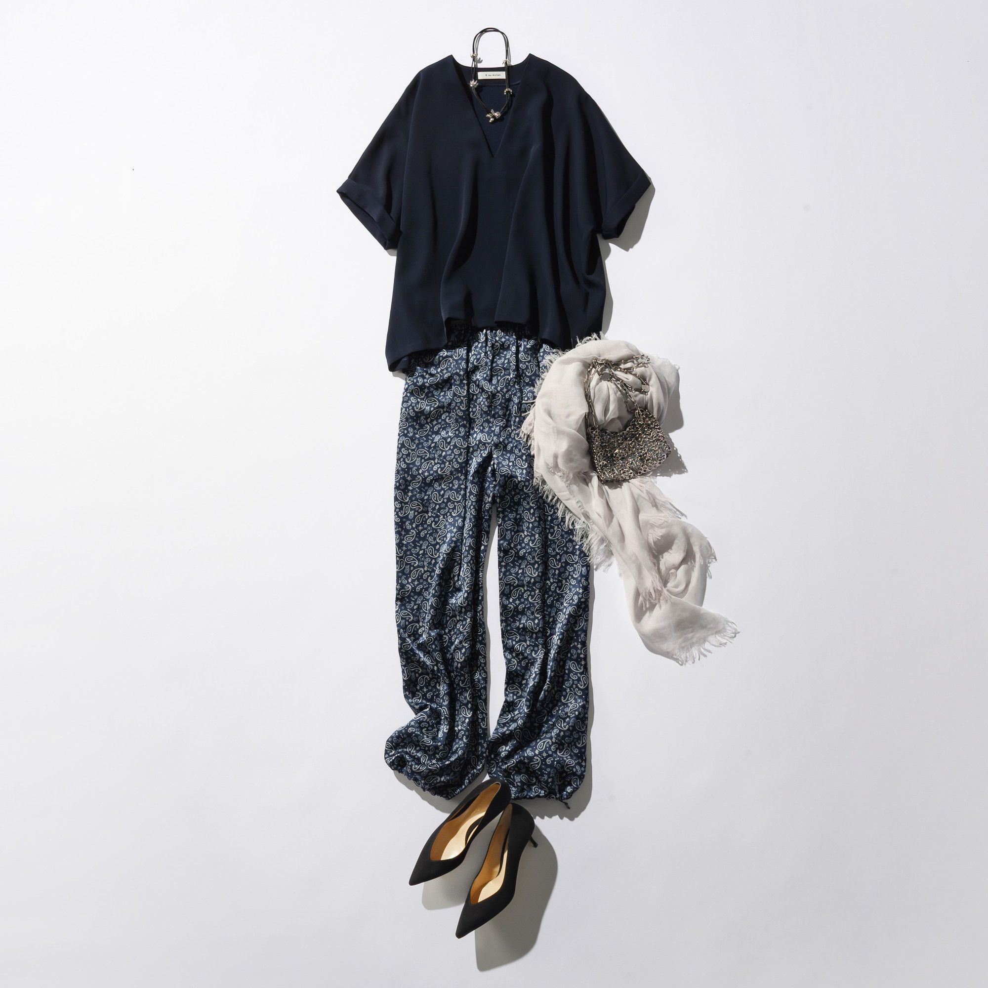 シルクならではの光沢としなやかさが特徴のプリントパンツ。細やかなペイズリー柄が品のいい華を感じさせる。ギャザーウエストからのドレープが美しく、カジュアル感がありながらもラフすぎない印象に。ウエストはゴム仕様で快適なはき心地。裾をドロストコードで絞り、シルエットを変化させることも可能だ。