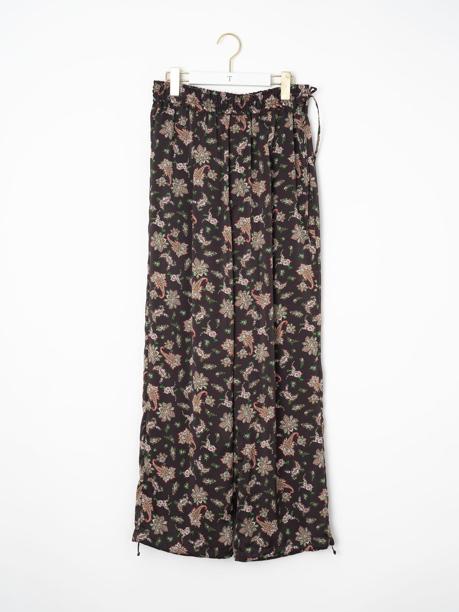 素材を生かすべく削ぎ落とされたデザインのリラクシーでフェミニンなパンツです。ゆったりとしたサイズ感ながら、スッキリとしたシルエットが嬉しい。上品なとろみのあるドレープ感に、桃のような肌触りとしなやかな柔らかさを持った素材です。アート感漂うペイズリー柄は、モチーフのバランスや線の細さ、色や配置のバランスなどにこだわって作成した美しい柄です。。ベースカラーのダークブラウンがトレンド感も演出しつつ、リラックス感と華やかさが共存すペイズリー柄です。。