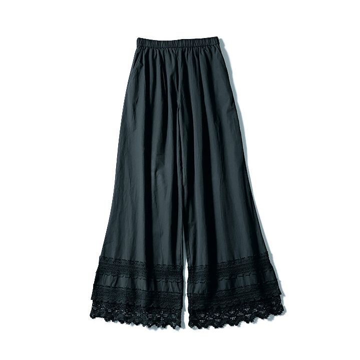 適度なハリ感と、サラッとした肌触りが特徴のコットンポプリン生地を用いたワイドパンツ。大胆に配したクロシェ調の裾レースがアクセントになっています。ギャザーゴムのウエストには、内側にフィット感が微調整できるドローコードをセット。インド綿らしい少し軽やかなブラックと、クリーンなホワイトの2色展開で、ともにひざ下丈の裏地付き。辛口カジュアル派も気負いなくはける甘さ控えめの裾レースパンツ。ややハリ感のあるコットンポプリン生地を使用したワイドシルエットは、汗ばむ気候でも足にまとわりつかず、風通し良好! 気になるレッグラインもさりげなくカバーします。裏地付きなので、インナーの透けも気になりません。ホワイトとブラックの全2 色展開。