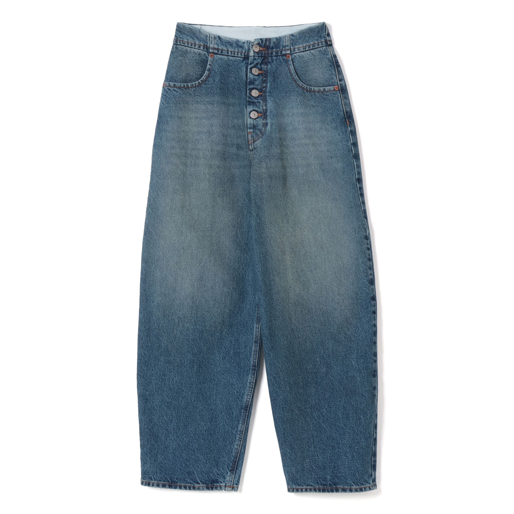 腿まわりのゆったりとしたシルエットが特徴的な最旬デニム。ヴィンテージ感を煽る色落ちや、フロントのボタンフライも視線を奪うデザイン。バックには「MM6」の象徴でもある、1本の白いステッチがあしらわれています。
