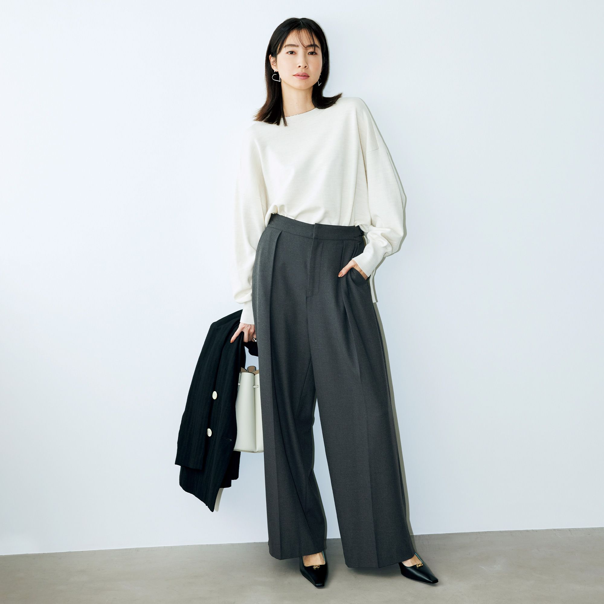 トレンド感とスタイルアップ効果が両立する絶妙ワイドシルエット。裏起毛素材なので暖かさはもちろん、着心地のよさも格段にアップ。くみさん理想のグレーと万能ブラックで。