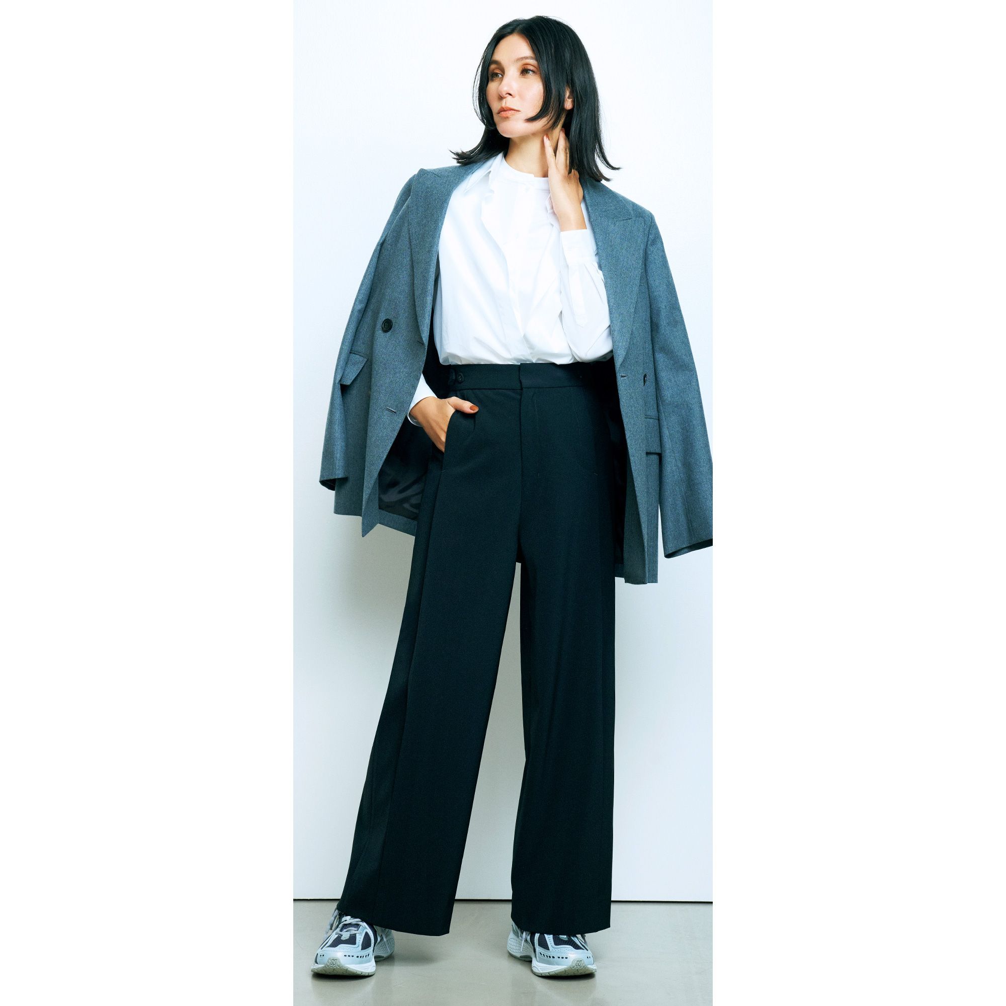 さまざまなトップスと相性のいいワイドストレートシルエット。シャープなフロントタックのほか、ヒップにダーツをあしらうことでもたつき感がなく、さらに後ろゴム仕様でストレスフリーな着心地。