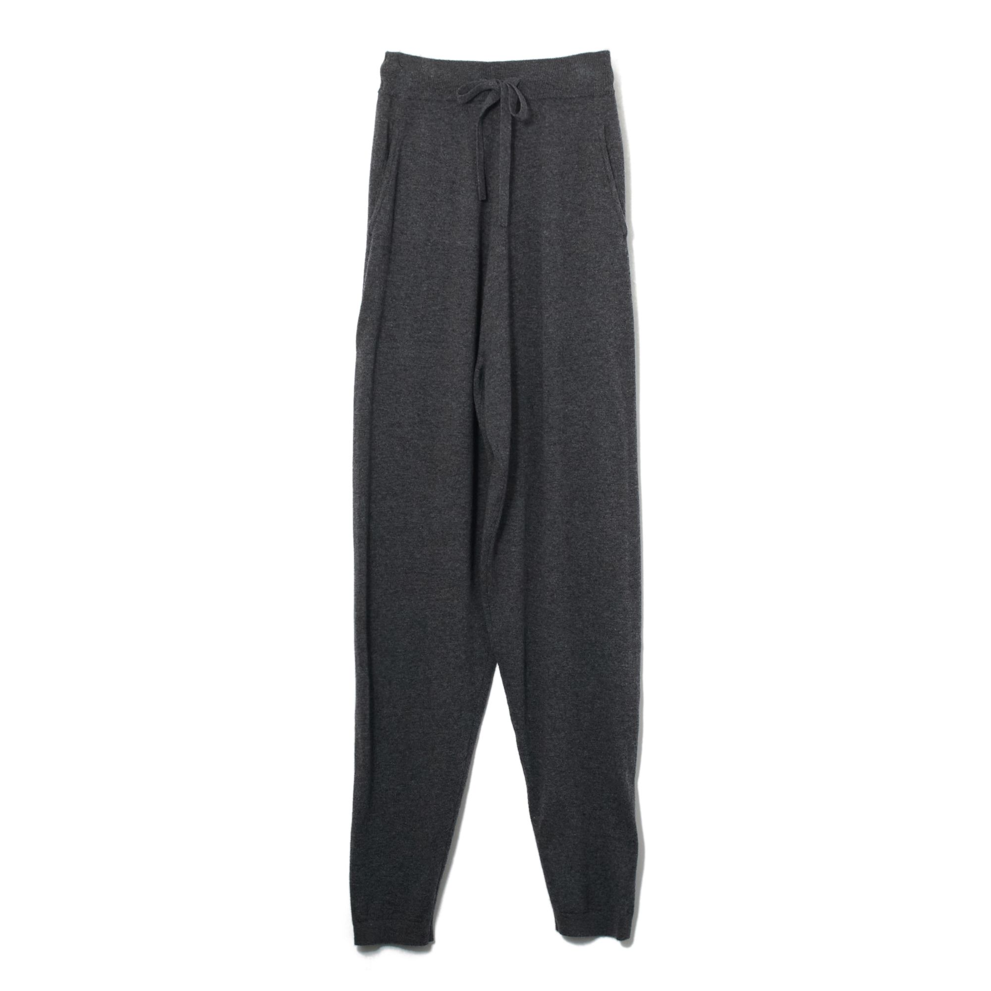 落ち感がある太めシルエットで体型を拾わないニットパンツ。裾を絞りすぎず、足首まわりでおしゃれっぽくたまるよう、あえて股下を長めに設定したのは、くみさんのこだわりだ。ゆとりのシルエットで下腹まわりをカムフラージュ。ウエストはドローストリングで体型に合わせて調節できる。ヒップから腰まですっぽり覆ってくれるシルエット。カシミヤ混だから暖かく、冷えが気になる人にもおすすめ。