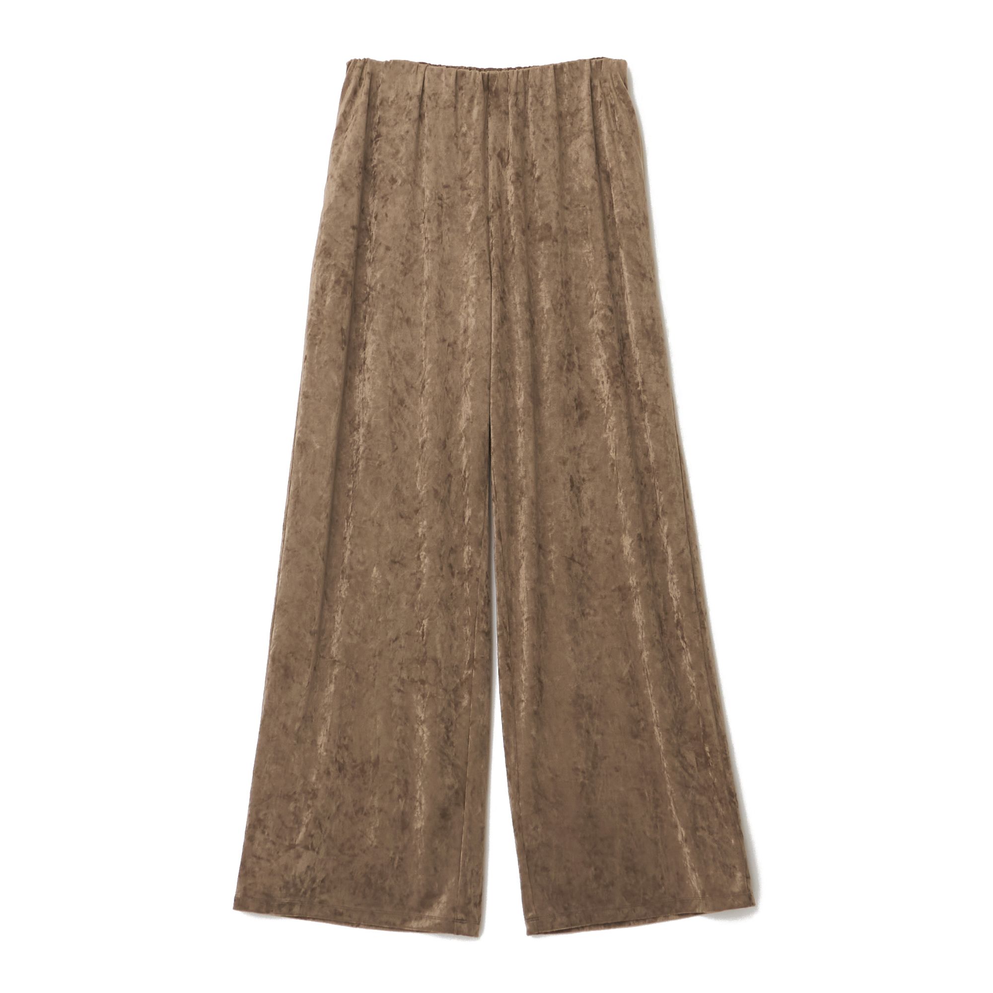 なめらかで品のいいツヤのベロア素材を使用。落ち感があり、縦に流れるゆるやかなドレープが生まれることで脚をほっそり見せてくれる。リラクシー感があるので簡単にこなれた雰囲気に。ウエストはオールゴム使用ではき心地快適。旅行にも便利。