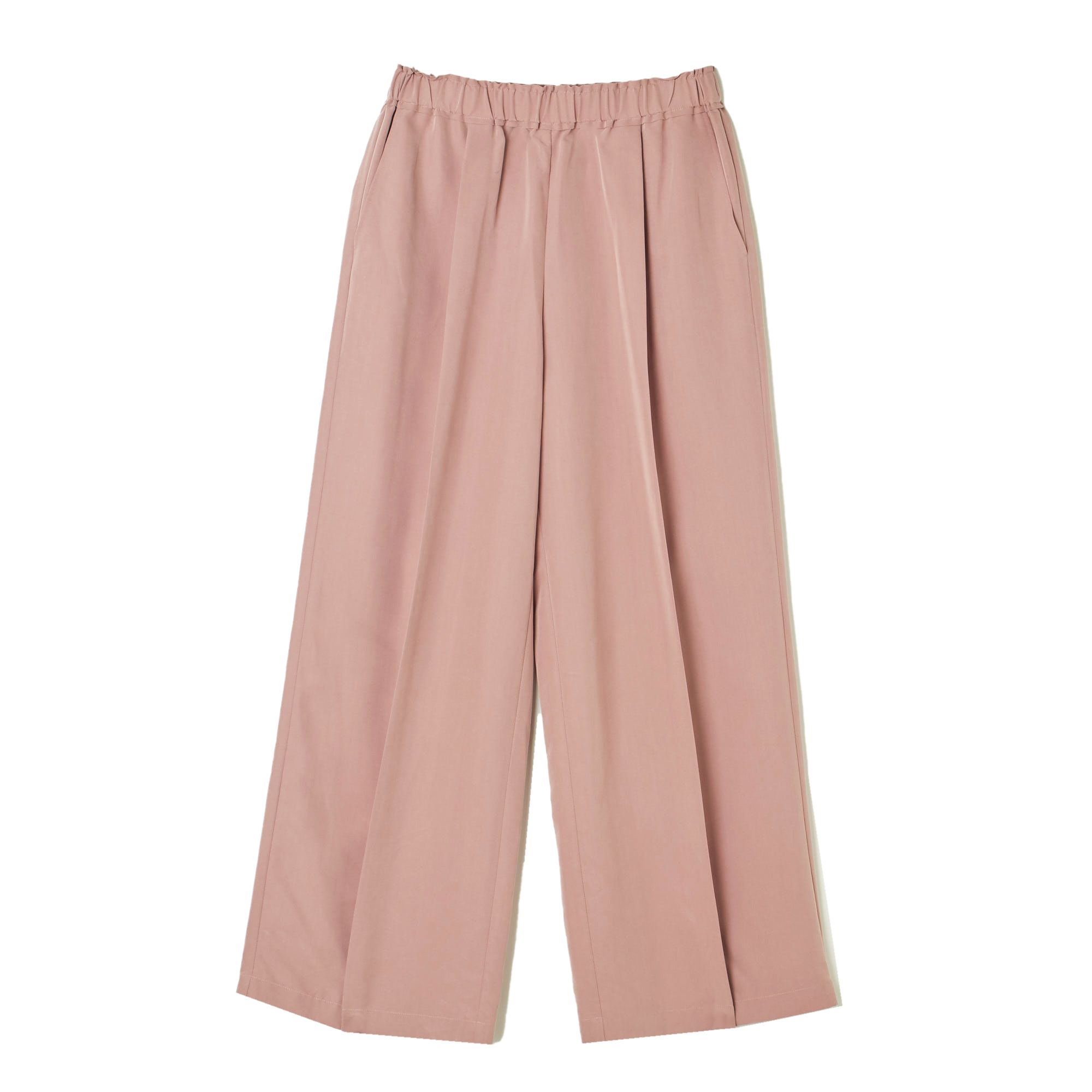 ほんのり表面感のあるサテン生地を仕様し、絶妙なテーパードラインに仕上げたタックパンツ。センタープレスが効いているので脚がすっきりまっすぐに見える。ウエストの前後はフラットで、両サイドにだけゴムを入れることで快適さときれいが両立。