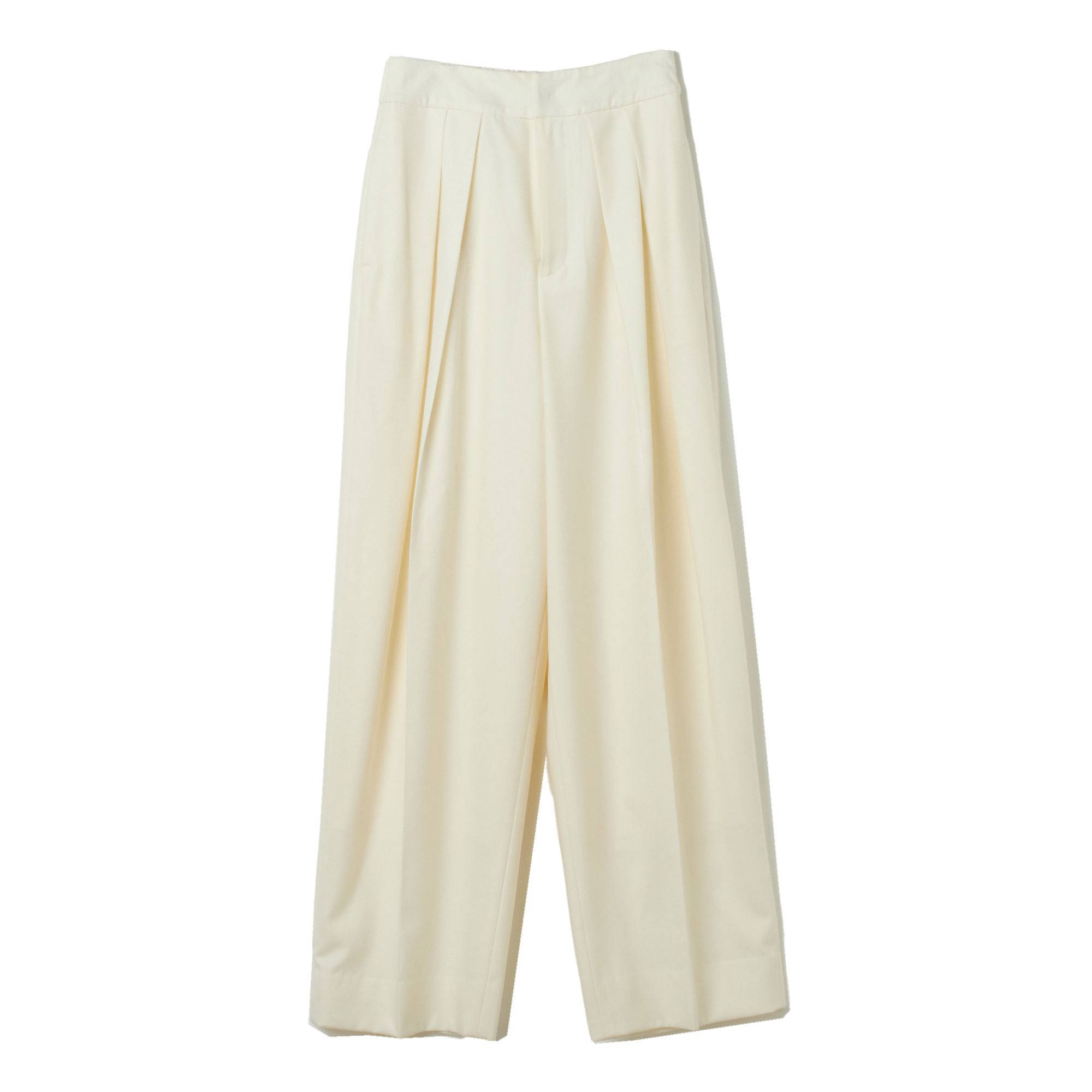 深いタックによるワイドな腰まわりから、裾に向けてテーパードする形が今っぽさ満点。上質な光沢感とセンタープレスが、脚長を立体的に演出。前はきちんとしたベルト仕立て、後ろはゴムで快適。