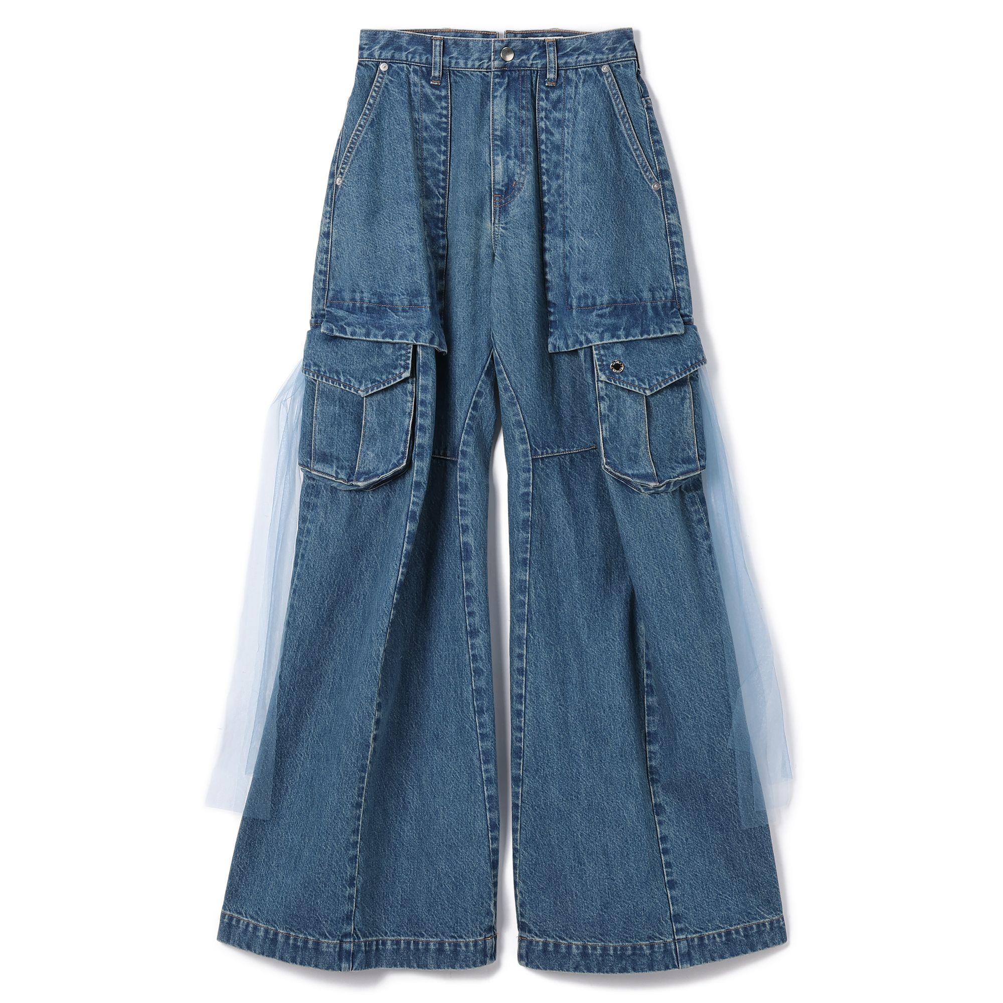 カーゴ風のルックスにチュールでアクセントをプラスした、個性派デニム。マチ付のサイドポケットも自然な立体感を与え、チュールを手持ちのスカーフやチャームで付け替えるのもおすすめ!バックのフックディテール、構築的な切り替えでどんなトップスも洒落感アップ間違いなし。