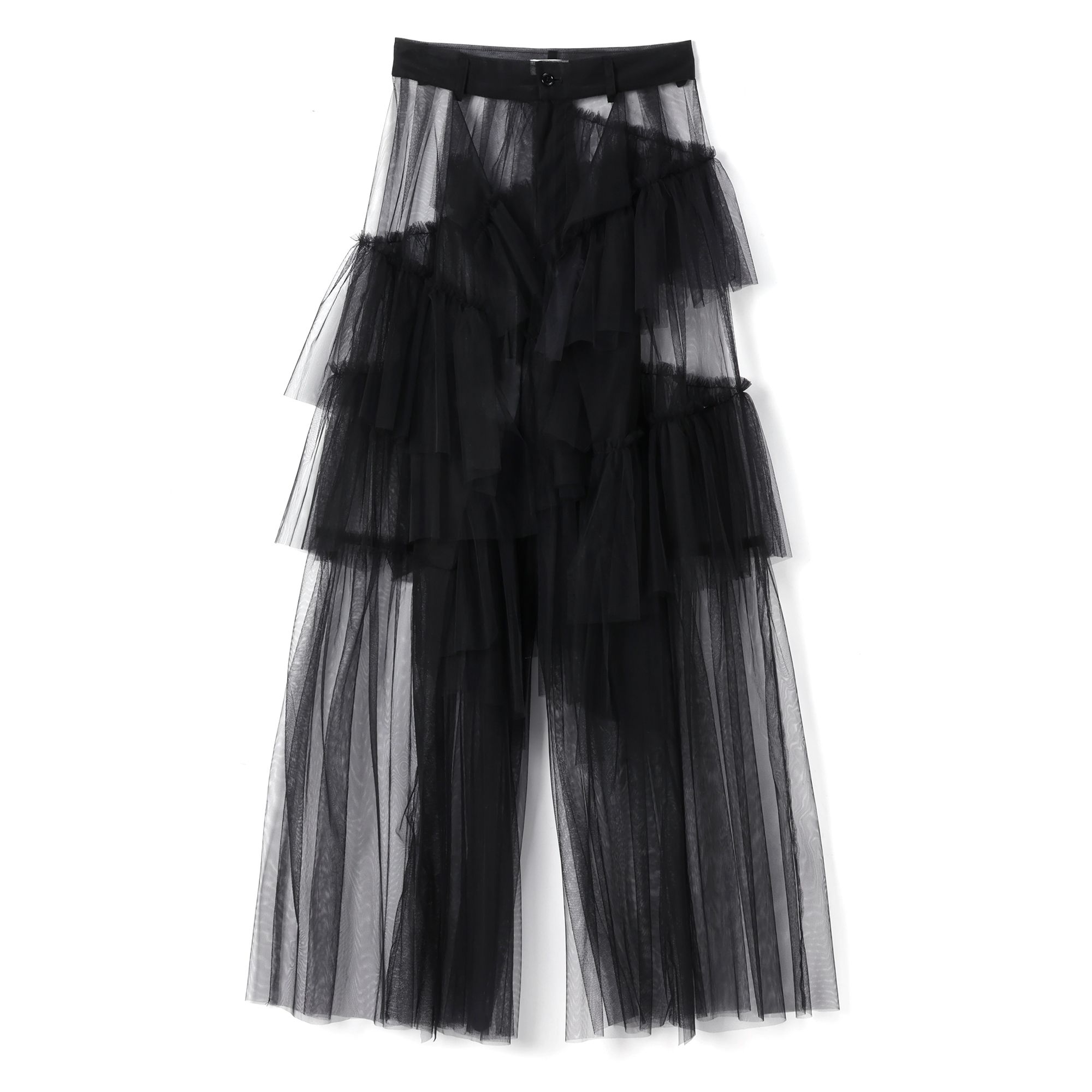 ランダムチュールが変化感のある奥行きを与えてくれるシアーパンツ。裾広がりのワイドシルエットなので手持ちのパンツにさっと重ねたり、素足を覗かせる攻めのスタイルも今季ムード。贅沢な生地ボリュームと、全方向着映える立体的なシアーデザインはパーティーシーンにも活躍必至!