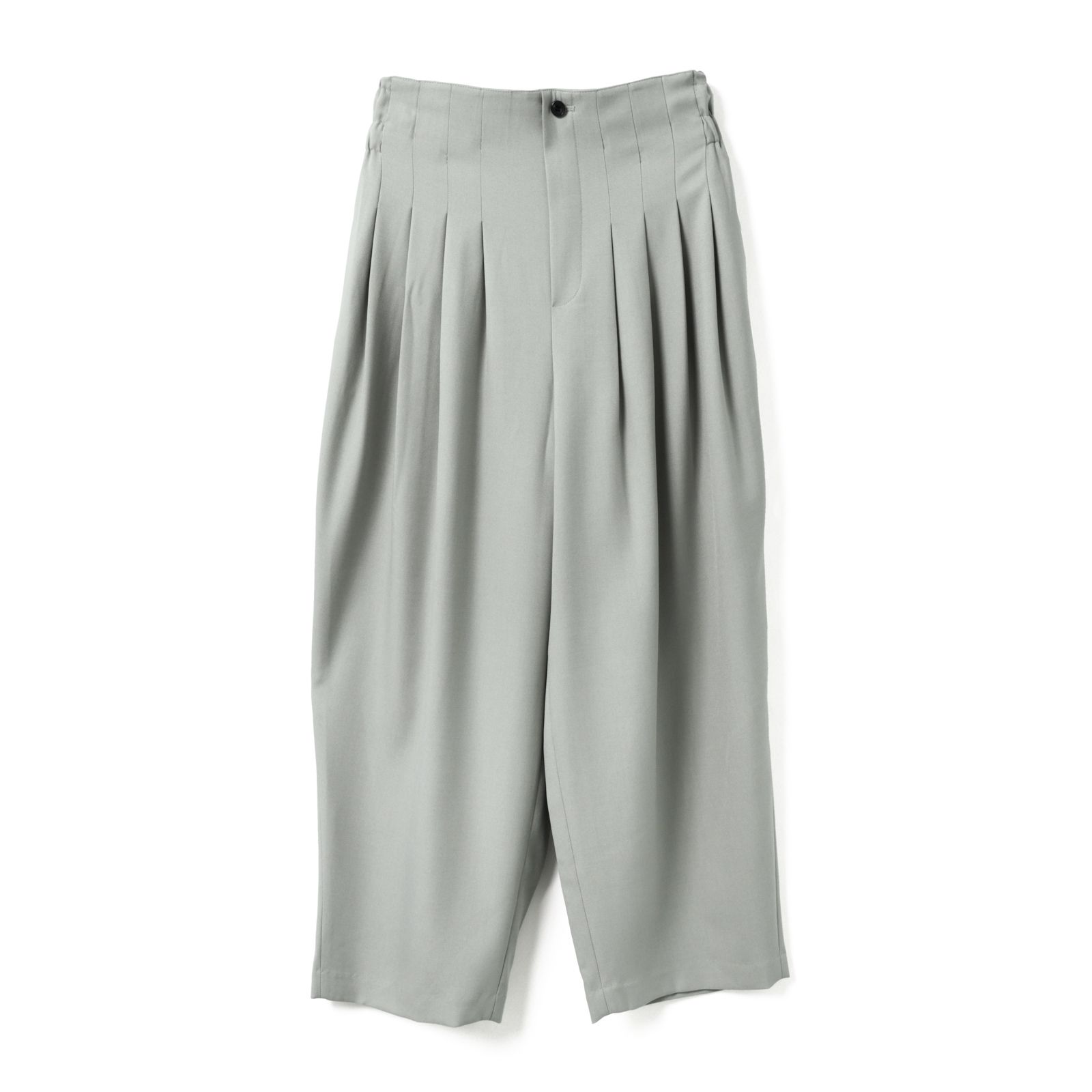 きれいめのハイウエストタックパンツで、タックは腰位置より下からデザインしておりウエスト前すっきり、後ろギャザーデザインが特徴。メンズトラッドをざっくりと穿いたようなラフさもありながらきれいめに着用できるパンツを表現しました。シャツインもしやすいデザインで内紐が付いているのでウエストキープしてくれます。ストレッチのきいた穿きやすい1枚です。