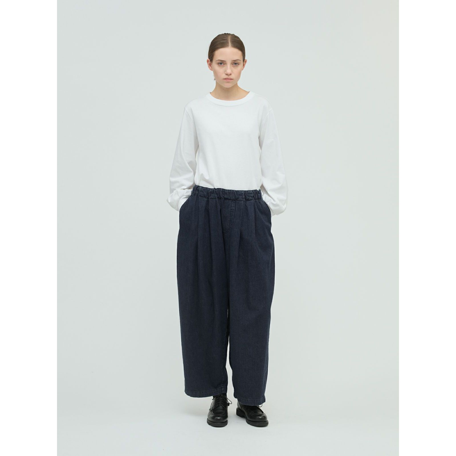 ブラックのステッチを採用してモード感を演出。しっとりとした生地感で、程よい落ち感が特徴。ゆとりのあるワイドシルエットを表現。ウエストはリラックス感のあるゴム使用。フェード色とワンウォッシュの2色展開です。人気のデニムシリーズで同シリーズ3-230102/デニムベストと3-230101/デニムワイドシャツも展開。セットアップでの着こなしもお勧めです。