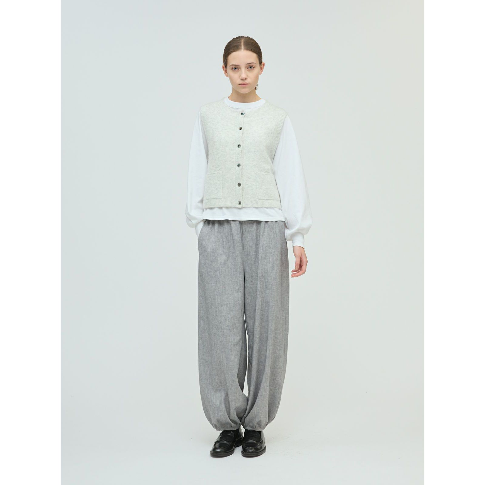 ウールライクな生地感が特徴で裾はゴムを使用せずタック仕上げにしています。スポーツMIXをイメージしていることもあり、ウエストはボクサーパンツからのゴムのフィット感も演出。裾が長めのためタックでクッション性のあるデザインパンツを表現した1枚です。