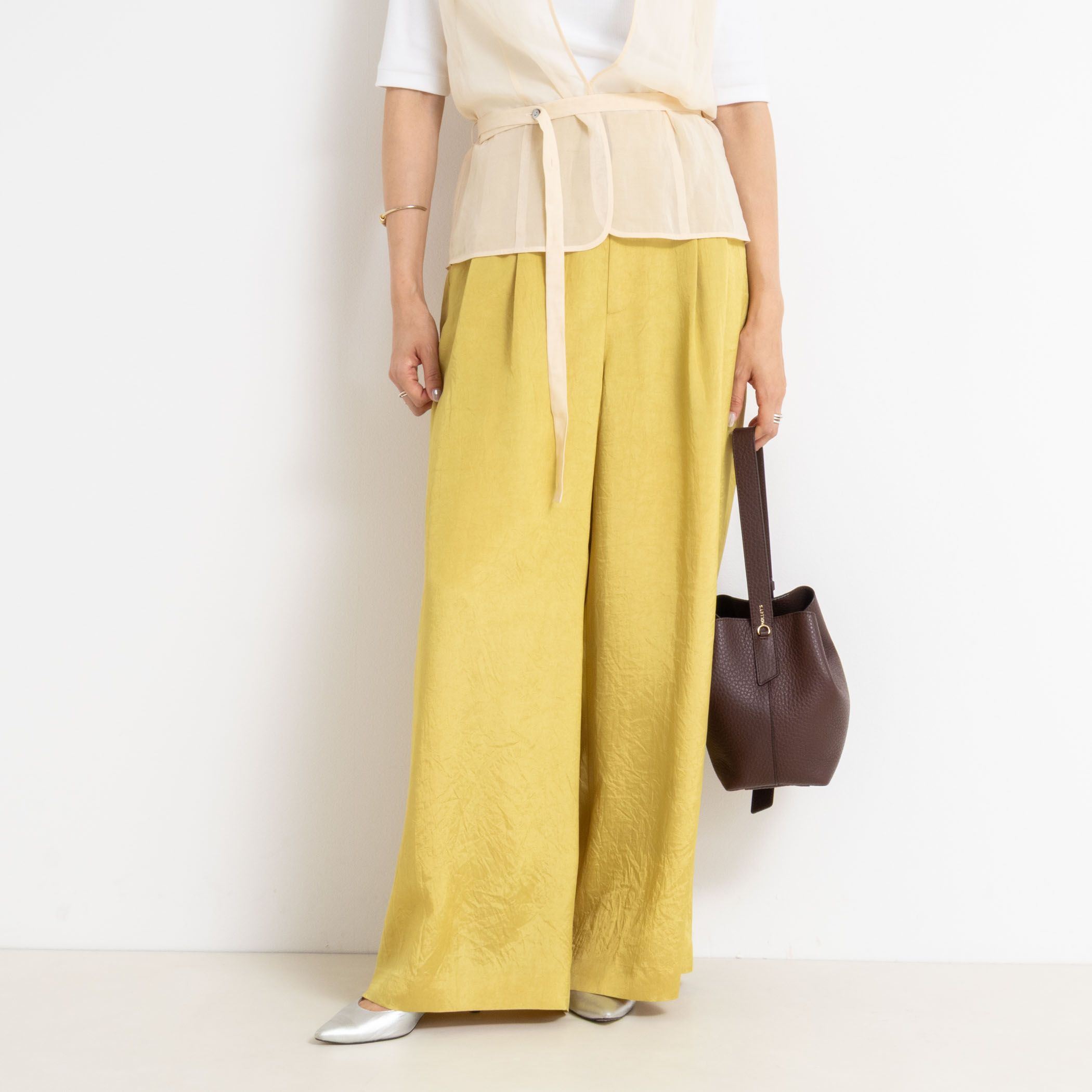 ◇25AW◇2nd NOLLEYS◆Point・クラッシュサテン(ランダムなひび割れ模様)がこなれ感を演出するワイドパンツ・フロントファスナー仕様、後ろウエストはインゴム仕様のイージーな穿き心地・タックのたっぷりとしたワイドシルエットですが、スタイル良く決まるようにパターンに拘った1枚・『EASTMAN』社のアセテートを使用したサステナブル素材・シルクのような艶感、発色性、しなやかな風合いに加え、接触冷感・速乾性に優れてた高機能素材・シーズンレスで着用可能・裏付き※39サイズ・・・38サイズと横巾は同じで股下のみ長いサイズになります(Tallサイズ)※39サイズはWEB&一部店舗限定サイズ※マスタードはWEB&一部店舗限定色●お取扱い上のご注意●末永くご愛用頂くために、アテンションタグを必ずご確認の上、着用又はお取り扱い下さい。気になる商品は、お気に入り登録がオススメです!クーポン情報、入荷情報が、通知されるようになります。※手洗い可※店頭及び屋外での撮影画像は、光の当たり具合で色味が違って見える場合があります。商品の色味は、スタジオ撮影の画像をご参照下さい。※商品画像に関しては出来る限り忠実に表示出来るよう努めておりますが、お客様がご利用のモニターの設定及び特性により、実際の商品と比較し色味に若干の誤差が生じる場合があります。※画像の商品はサンプルとなりますので実際の商品と仕様、加工、サイズが若干異なる場合がございます。