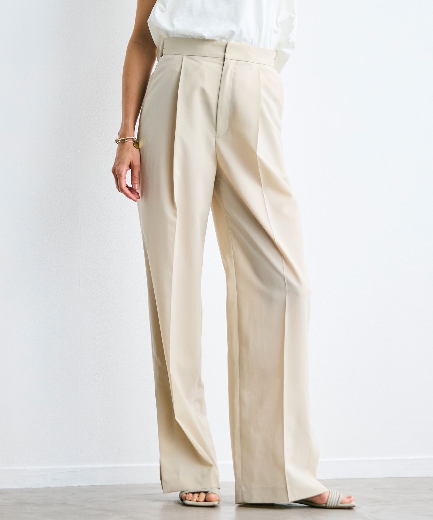 BATEAU(バトー)すっきりとした落ち感が美しい程よくイージーなタックワイドパンツ■デザイン昨年ご好評をいただいた人気素材にタックワイドパンツが登場。後ろのウエストゴムで着心地は楽に、広がりすぎずタイトすぎずすっきりと着られるシルエット。サイドヘムのスリットからヘルシーに肌をのぞかせつつ、ベージュ、トープ、ブラックのニュアンスカラーが洒落感を出し、同素材のジャケットと合わせてワンピース風の着こなしや単品としてお仕事やデイリーにも幅広く着回せるタックパンツです。■素材さらりとしたドライタッチの風合いで、ご自宅でもお洗濯ができるイージーケア性にも優れた素材。シワになりにくく、吸水、速乾、UVケア、接触冷感も兼ね備え春夏秋と涼やかにスリーシーズン着回しできるマルチファンクション素材です。■同素材アイテムBATEAU / ボタンレスノーカラジャケットBATEAU / VネックバックギャザーハーフスリーブブラウスBATEAU / イージーウエストIラインロングスカートBATEAU / フレンチスリーブAラインタックワンピース※照明の関係やパソコンなどの環境により、若干製品と画像のカラーが異なる場合もございます。また商品画像はサンプルを使用しているため、実際にお届けする商品と色味や仕様の変更がある場合がございます。ご了承くださいませ。