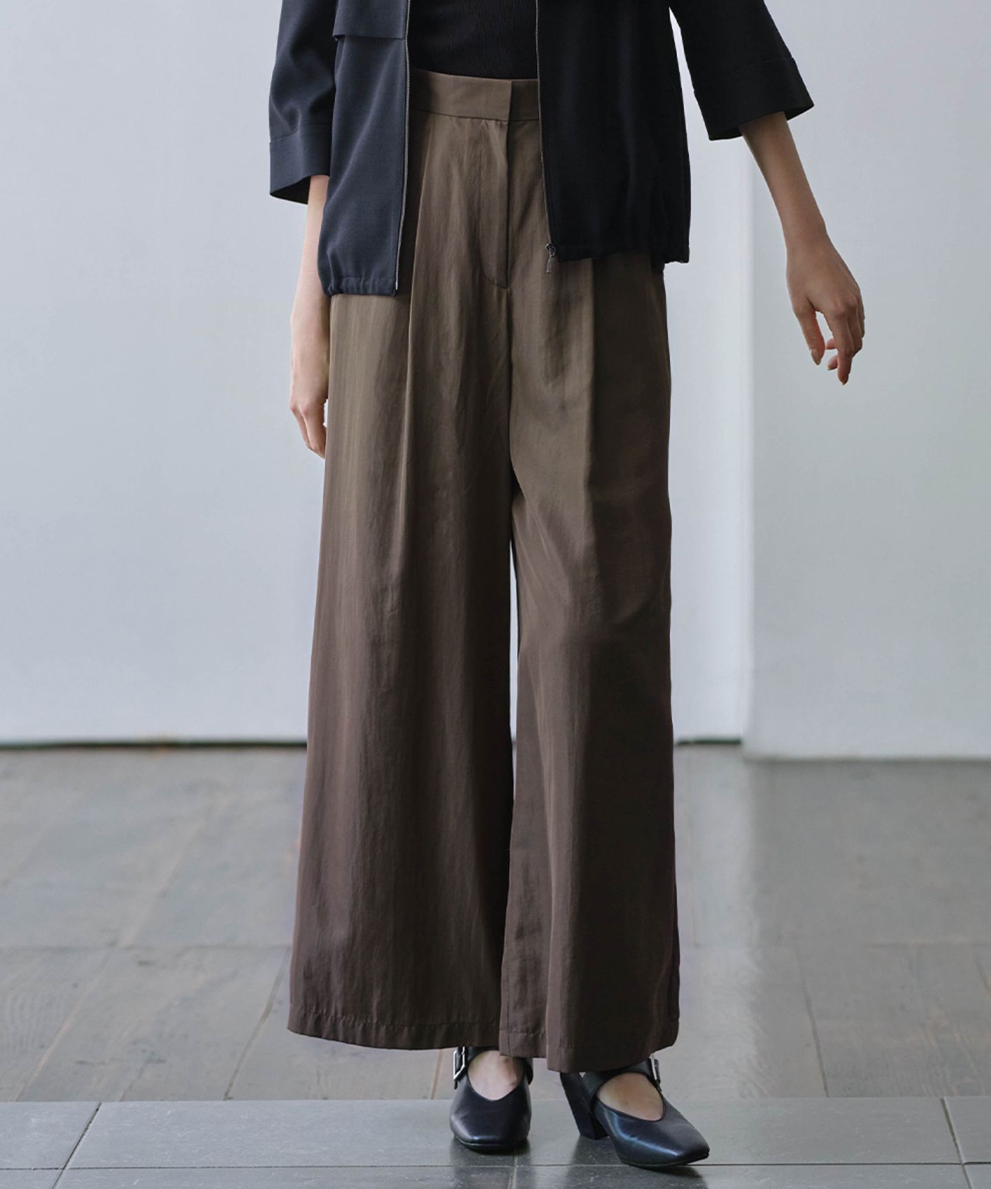 2025SS機能性を備えた素材も魅力シーンを問わずデイリーに活躍するワイドパンツ■デザインセンタープレス入りのワイドパンツです。ウエスト部分はゴムを内蔵させたスマートバック仕様で、ラクな履き心地ながらトップスINもすっきり決まります。ノータックでウエスト回りがスッキリとした印象で、スタイリッシュに履いていただけます。トップスを選ばず、カジュアルからビジネスまで幅広いシーンで活躍する万能アイテムです。■素材フルダル糸シェルタリングを使用したオックス素材です。コットンリネンの混紡糸を使用し、仕上げにタンブラー加工を施しているため、ナチュラルな表情感に仕上げています。■機能性1)接触冷感ひんやりとした爽やかタッチの素材だから、暑いシーズンでも快適な着心地。2)UVカット3)透け防止4)吸水速乾汗をかく季節でもサラリと着用可能。手洗い後に乾きやすいのも嬉しいポイント。5)Washableご自宅での手洗いが可能なイージーケア。※商品の取り扱い方法につきましては、タグ等に記載されている「取り扱い上の注意」「洗濯表示」をご確認ください。※採寸情報はサンプル商品のデータです。実際の商品と仕様が異なる場合がございます。※商品画像はサンプルを使用しているため、実際にお届けする商品と色味やサイズなどの仕様に変更がある場合がございます。予めご了承ください。