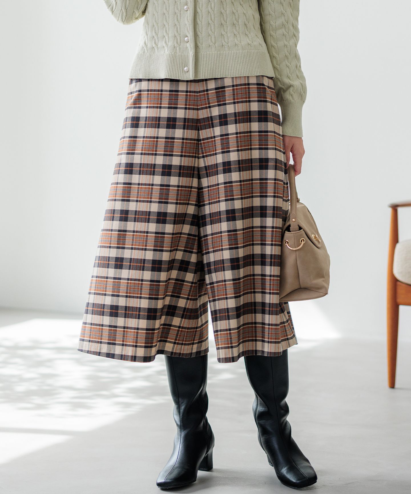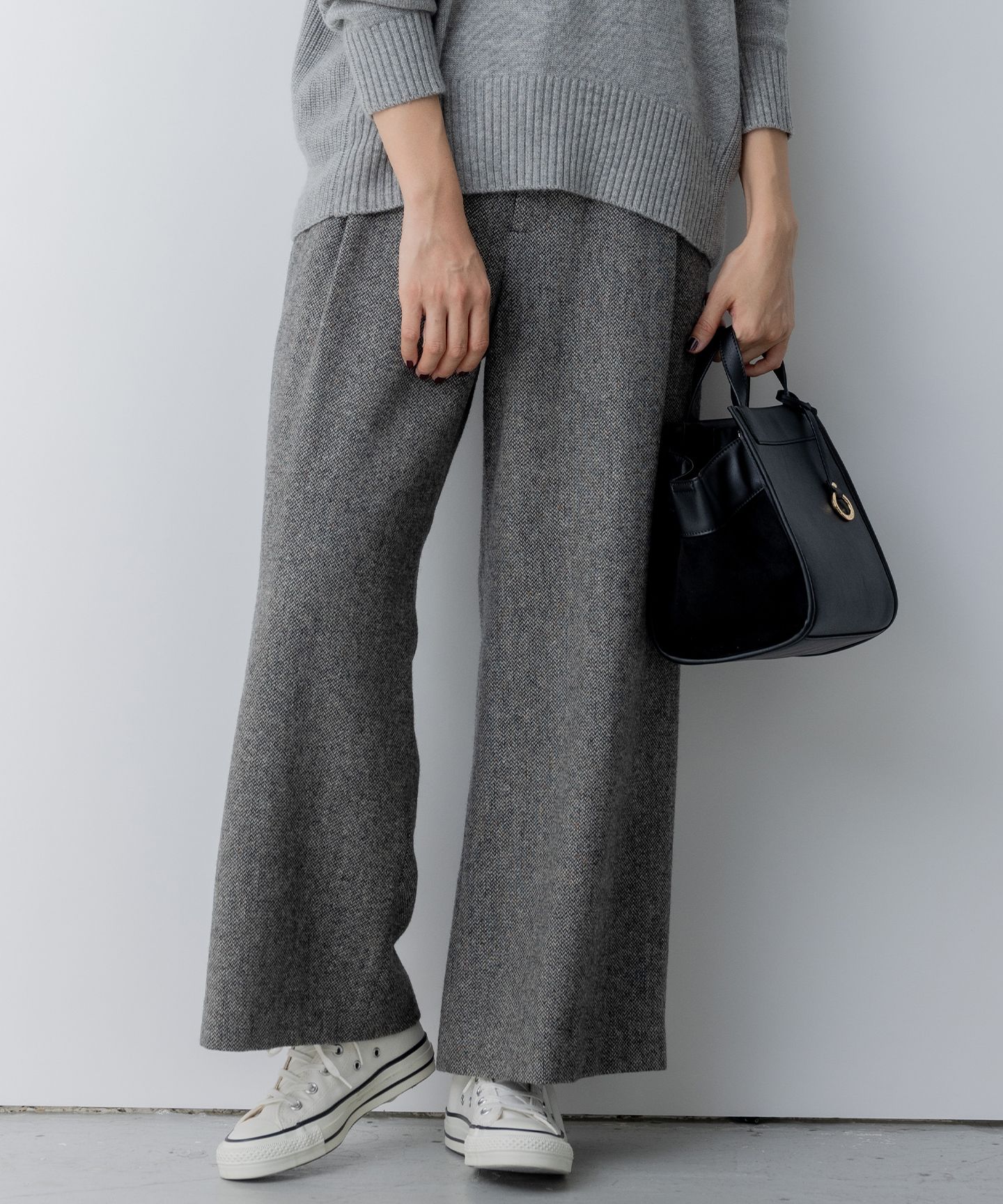スカート見えの大人上品なキュロットパンツ■デザイン・スカートのように見えるシルエットで、パンツの動きやすさと上品さを兼ね備えた大人のキュロット。・程よい丈感と分量にこだわり、フロントに入る深めのタックで縦のラインを強調しすっきりとした印象に。・後ろウエストはゴム仕様で、すっきりした見え感ながら着心地はリラクシーに仕上げました。■素材・シワになりにくくストレッチ性が優れている柔らかな着心地の良い素材です。・ドレープ性に優れた素材なのでボリュームのあるデザインに向いた素材感です。・表裏の両面微起毛加工が施してあるのでウォーム感と肌触りの良さが魅力。・♯304は使いやすい組曲オリジナルのチャコールチェック柄です。【スタッフコメント】▼身長158cm|着用サイズ2 (通常着用サイズM)今シーズンの組曲イチオシ素材を使用した着心地抜群なキュロットパンツ。スカート見えのシルエットなのでキレイめなスタイリングにもおすすめです◎============================洗濯方法:手洗い可裏地:あり伸縮性:なし透け感:なし============================【注意事項】※撮影時の照明の関係により、色味が若干異なって見える場合がございます。商品の色味はハンガー吊り画像をご参照ください。※画像はサンプルを使用しているため、実際にお届けする商品と色味やサイズ等の仕様に変更がある場合がございます。▼気になるアイテムは『お気に入り登録』がおすすめ▼お好きなカラー&サイズを選んで?マークをクリック!再入荷通知や、ラスト1点の通知、セールの通知も受け取ることができます。