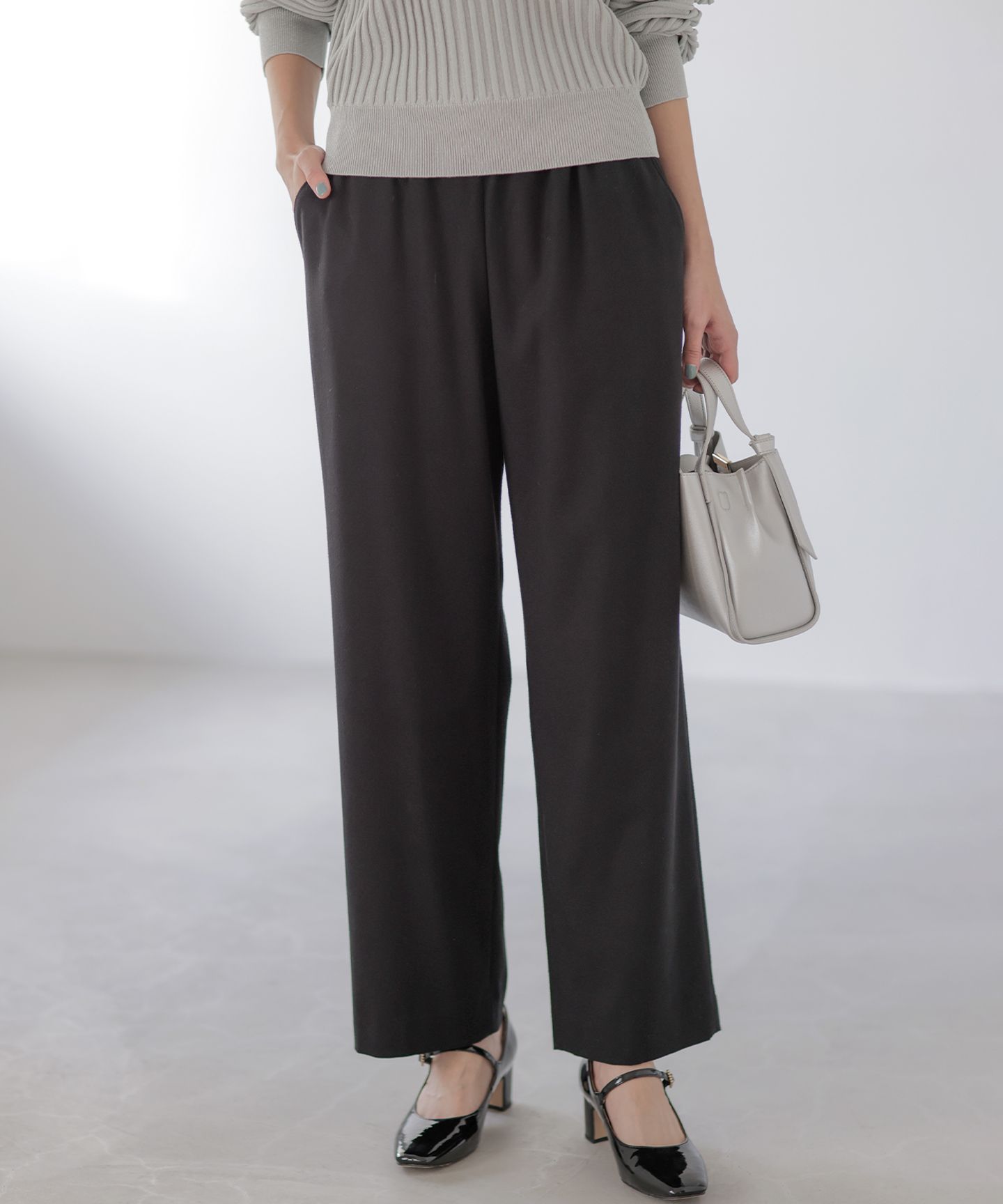 ストレスフリーなはき心地ときちんと見えを叶える、優秀イージーパンツ■デザインウールライクな起毛感がありながらノンウール素材でシーズンレスに着用でき、ウエストはゴム仕様、フロントはフラットなヨーク見えできちんと感のあるデザインのイージーパンツ。ストレスフリーなはき心地でありながら、センタープレスと裾に向かって細くなったテーパードのシルエットがカジュアル感を抑え、まっすぐ美脚に見えるデザインに。大人の求めるすっきりとしたきれいな見た目に仕上げました。人によっては気になる腰回り、ヒップ、太もも、ふくらはぎまで、それぞれゆとりをもって包み込むことで体のラインを綺麗に見せてくれます。股上を深めにすることで、動いた時に下に引っ張られてウエストがずれ落ちるような違和感も抑えています。デイリーからお出かけシーンまで幅広く活躍してくれるパンツです。■素材ベーシックなウール素材をイメージし、着心地の良いポリエステルレーヨンで表現。コンパクトな表面感とドライタッチでありながらやさしい起毛感を施し、身体のラインやインナーのラインを拾いにくい適度な肉感にこだわったストレッチ素材です。艶と光沢があるので上品見えし、程よい軽さと立体感があるので綺麗なラインを保ちつつシワにもなりにくいです。またピリングになりにくい糸を使用し、生地の仕上げ工程を工夫することで、硬くならずしっとり感が残るように仕上げています。肌触りもよく長いシーズン活躍してくれます。※撮影時の照明の関係により、色味が若干異なって見える場合がございます。実際にお届けする商品の色味はハンガー吊り画像をご参照ください。※画像はサンプルを使用しているため、実際にお届けする商品と色味やサイズ等の使用に変更がある場合がございます。予めご了承ください。【お買い物をより楽しんで頂くために】▼商品のお気に入り登録ハートマークをクリックし、お好きなカラーを選んでお気に入りに登録が完了!完売カラーの再入荷通知や、ラスト1点の通知、セールの通知も受け取ることができます。▼ブランドのお気に入り登録新商品や再入荷等、いち早くブランドのお得な情報を受け取ることができます。