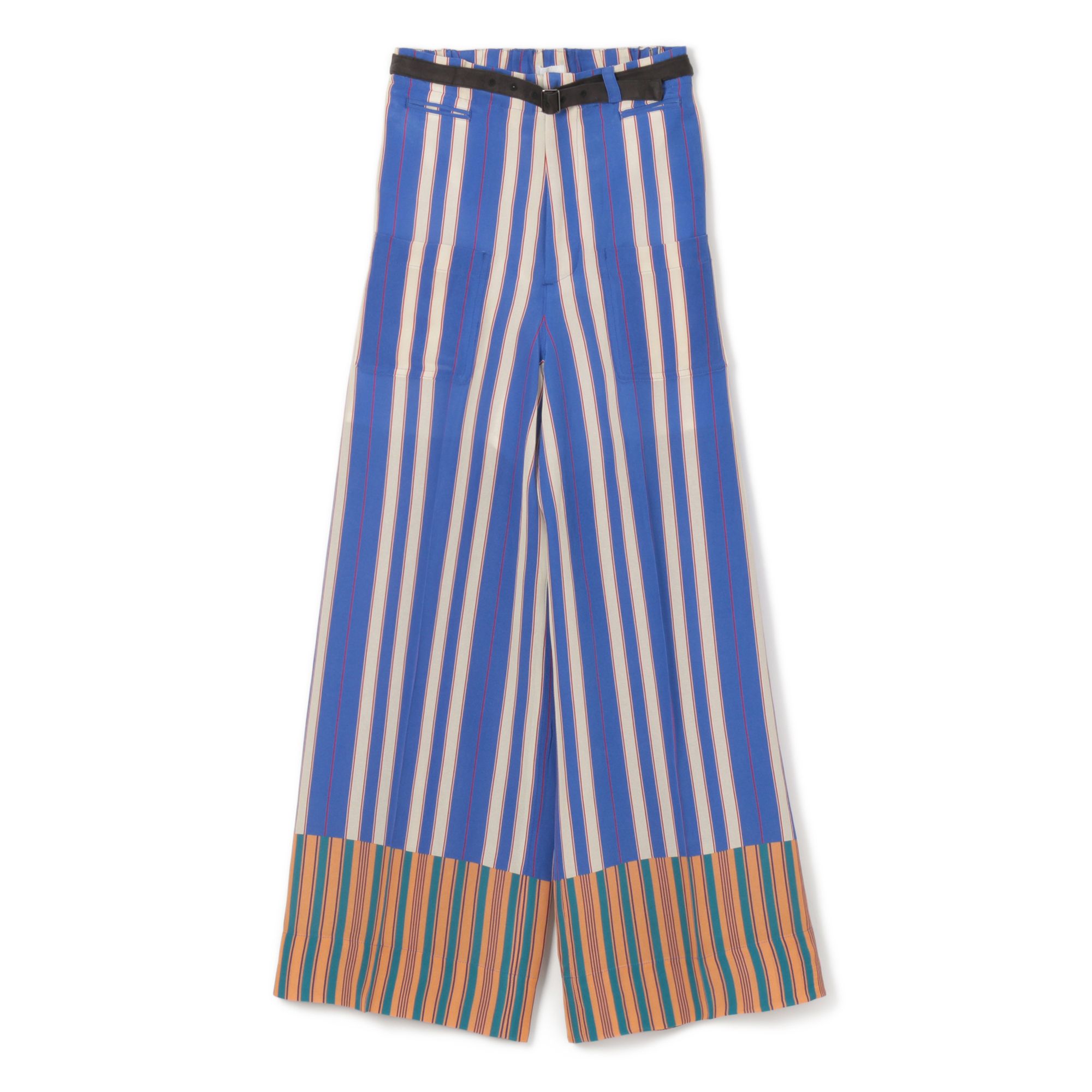 シルエットの美しさと素材感にこだわった、旬モードなワイドパンツ。メリハリのあるストライプ柄や折り返し風のデザインにどこかレトロな雰囲気が漂い、印象度の高いスタイルが即完成。付属の細ベルトや裾のジップ使いなど、こだわりのディテールが光ります。