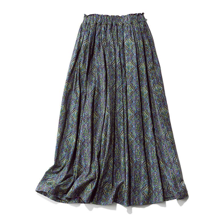 イタリアの実力派メーカー「fabric lab」の生地を使った、スペシャルな別注ミモレ丈スカート。ほんのり光沢のあるペイズリー柄のジャカード素材は、ソフトでありながら張り感も備え、さらにストレッチがきいているので着心地のよさも上々。無地の黒スカートとは一線を画す、抜群の存在感を放ちます。四枚はぎのフレアラインから生まれる優美な動きで、着る人の女性らしさも一気に加速。