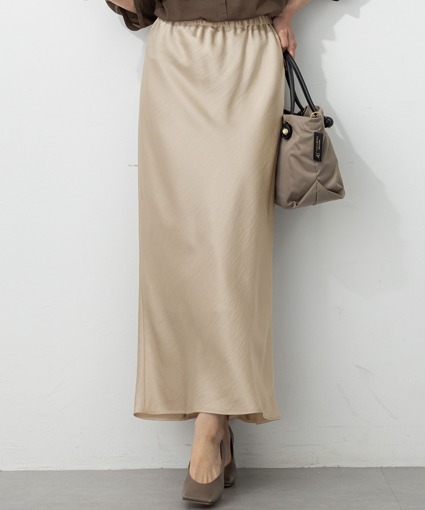 2025 Autumn表情感のあるサテン素材で、スタイリングを格上げしてくれるナロースカート■デザイン表情感のあるサテンナロースカート。すっきりとしたシルエットで上品な印象を与えてくれます。後ろは裾に向かってマチをつけており、正面から見た時は細いラインに見せつつ、着用すると足捌きがしやすいアイテムに仕上げました。シャツやカットソーとのシンプルなスタイリングはもちろん、ゆるめのニットとのスタイリングもおすすめです。 カラーは、落ち着いた色味で艶が美しいグレー(#004)と、ほんのり赤みのある柔らかなベージュ(#033)の2色展開です。■素材トリアセテートとナイロンを使用したサテン素材です。ナイロンを使用することでタテ方向に特有の表情感を出し、仕上げにはふっくらとさせるタンブラー加工を加えて風合い豊かに仕上げています。トリアセテートの発色性とシルクのような風合いも併せ持った素材です。※画像はサンプルを使用している為、実際にお届けする商品と仕様が異なる場合がございます。※サンプルはモデルサイズを使用している為、実際の商品のサイズはサイズ詳細の実測をご参照ください。