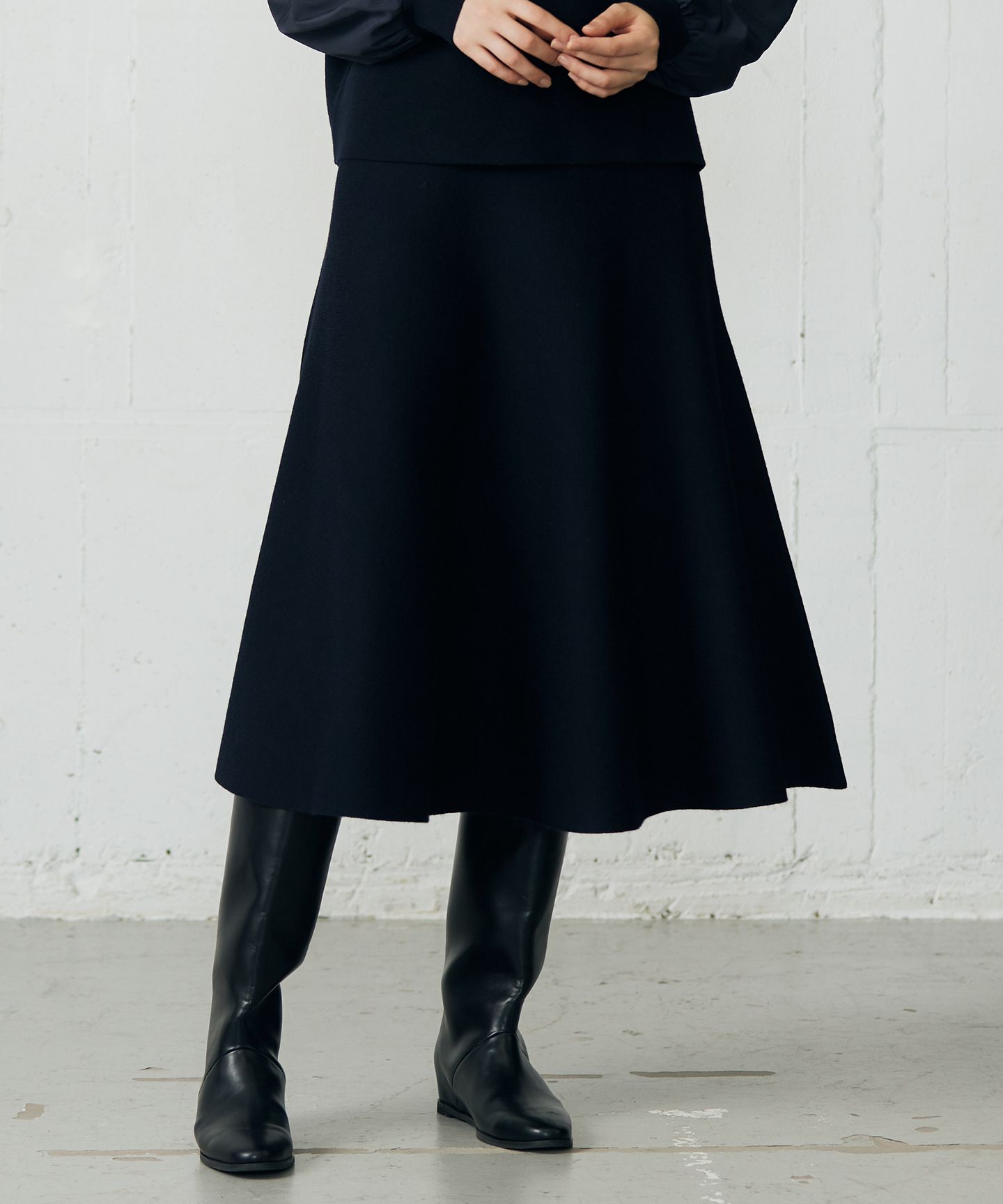 素材のハリ感とシルエットで体のラインを拾いにくいニットスカート■デザイン素材のハリ感を活かしたニットスカートです。生地がしっかりとしていて伸縮性も少ないミラノリブなので体のラインを拾いにくく、フレアシルエットが綺麗に出るデザインです。ウエスト部分は総ゴムになっているので快適に着て頂けます。同素材のトップスとセットアップでの着用がおすすめです。■素材しなやかなウールと、糸に撚り戻しをかけ膨らみと軽さが特徴のバルキーアクリルをブレンドした糸で、適度にハリとコシのある中肉のミラノリブを作りました。コンパクトですっきりとした肌触りです。■同素材アイテムランタンスリーブニット(KRWMGW0557)ワンピース(OPWMGW0556)※画像はサンプルを使用している為、実際にお届けする商品と仕様、加工、サイズが若干異なる場合がございます。予めご了承ください。※撮影環境の都合上、実際の商品と色味が異なって見える場合がございます。