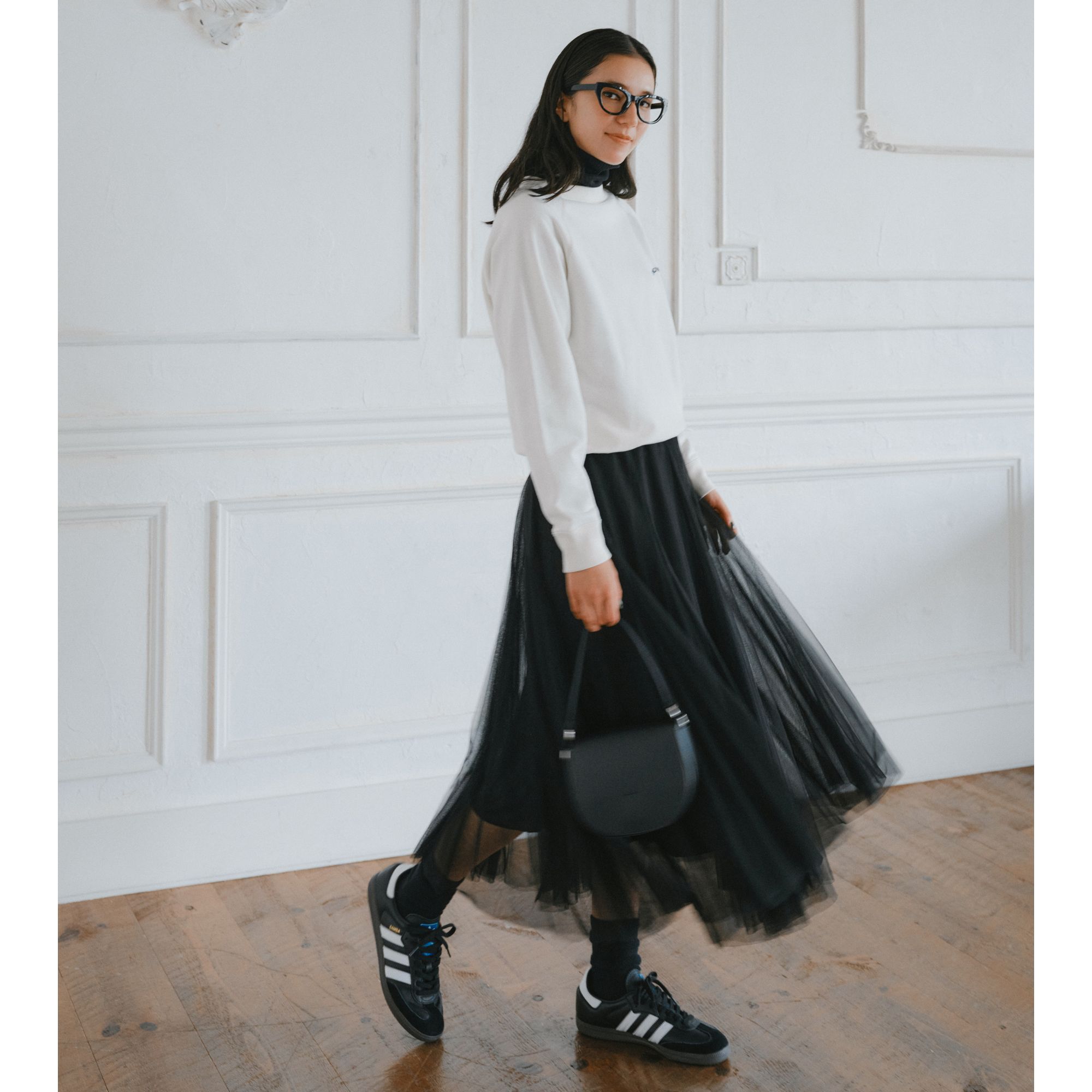 子供っぽくなりがちな素材ですが、光沢を抑えていてふんわりしているのに広がりすぎない、シアー感も含めてとても品のある雰囲気になります。広がりすぎないので腰回りにボリュームがですぎないのもチュールなのに稀有なポイントになっています。ウエストはゴム。落ち着いた同色のカラーです。とても楽な着心地ですがゴムが気になる方はトップスをブラウジングして被せたり、ベルトを合わせても可愛いです。カジュアルなプリントTに合わせたり、秋口にはスウェットに合わせても可愛いです。フードが付いたパーカーやニットアイテムとも好相性です。足元はヒールやブーツ、スニーカーも。靴下と合わせてもシックとカジュアルのバランスが可愛いですよ![着用時期]通年[透け感]裏地がありますがほんのり透け感があるのでインナーを併せて着用してください[生地の厚み]かなり薄手素材が重なっています[ストレッチ]なし(ウエストはあり)[生地のやわらかさ]やわらかい[生地の特徴]目の細かい柔らかいチュール[落ち感]チュール素材の中ではある方(広がりすぎない)[着用ジワ]なりにくい[身長]全ての方に(低身長の方はハイウエスト気味で)※感じ方には個人差がございますので気になる部分がありましたらお気軽にお問い合わせください