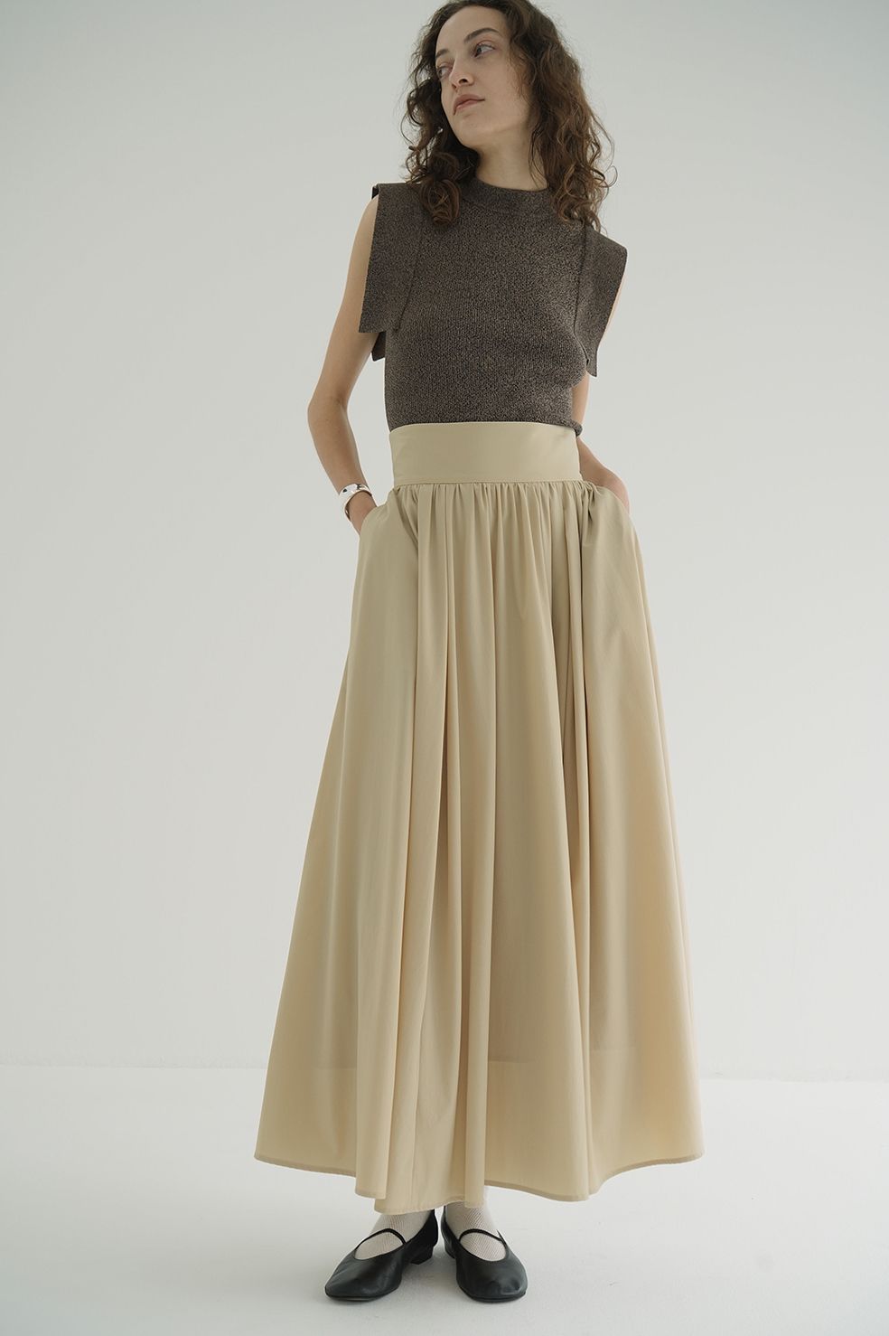 ウエストから腰にかけてスッキリとさせ、切り替えからギャザータックを贅沢にいれボリュームを出しました。歩くたびに揺れるヘムラインが女性らしいアイテムです。