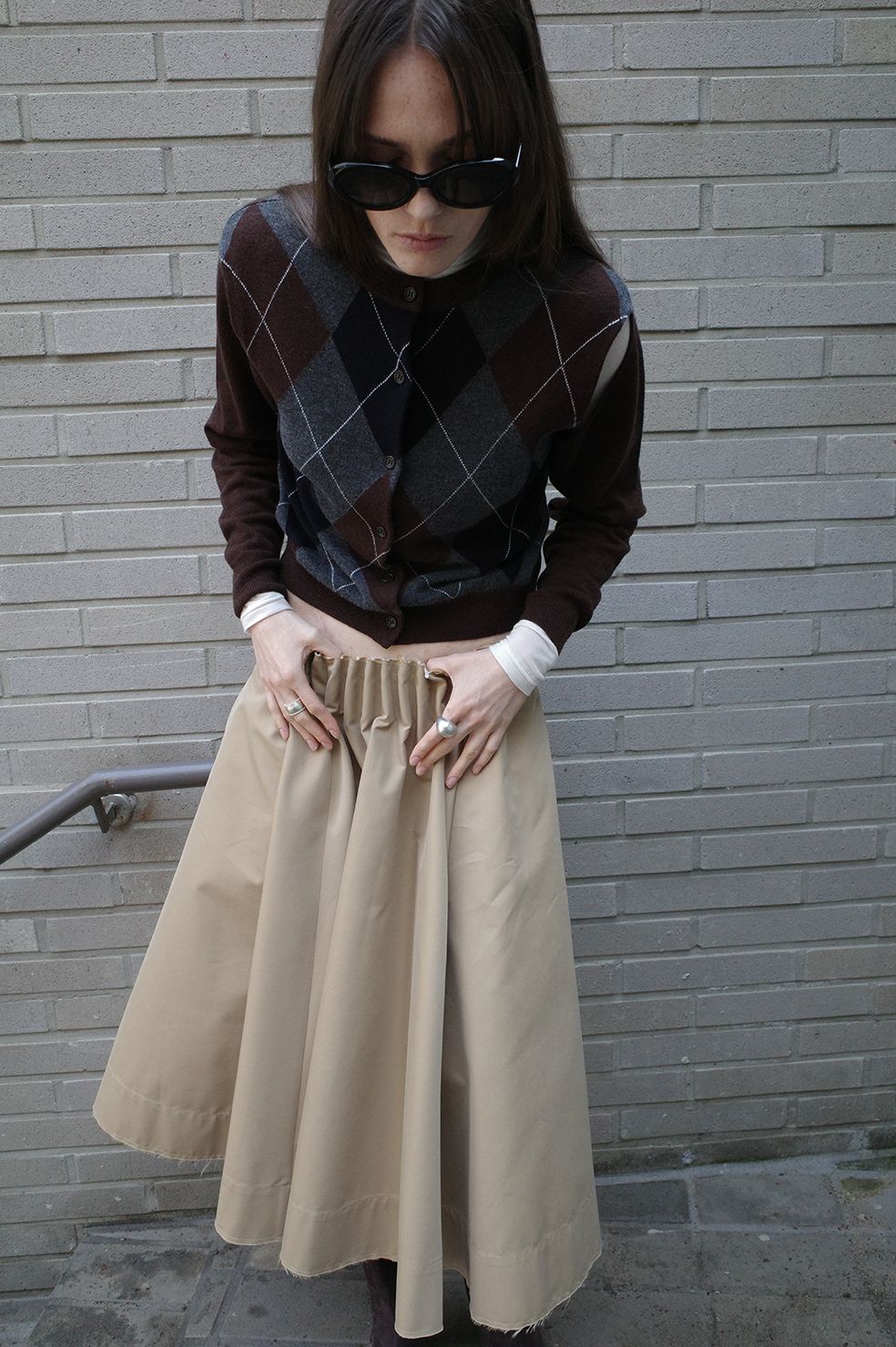 ウエストと裾のカットオフ加工で抜け感をプラスしたフレアスカート。トレンチコートのようなハリのある生地で仕上げ、肌に張り付かない裏地付きもポイント。裏地の覗くマーベルトデザインやワイドなタック切り替えなど、シンプルでありながらも存在感のあるデザインです。