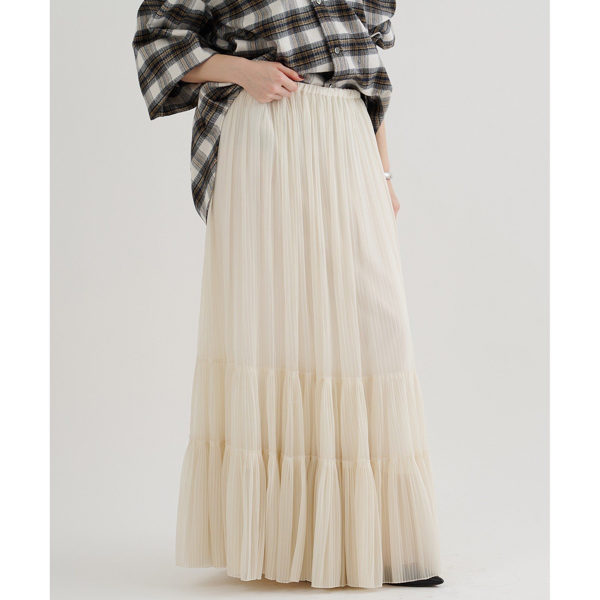 【2026SS】フェミニンさとカジュアルさを兼ね備えた、大人のプリーツスカート■軽やかなオーガンジー素材を使用したティアードスカート。■繊細なシアー感と細かいプリーツが上品な立体感をプラス。■断ち切りで切り替えを入れることで、抜け感のある軽やかな表情を演出。■程よいボリューム感がありながらも、ウエストはゴム仕様でリラックスした着心地。■フェミニンさとカジュアルさを兼ね備え、動きのあるデザインに仕上げた大人の上質スカート。【COLOR】オフホワイト:軽やかさと可憐さを演出する柔らかなオフホワイト。ブラック:モードなニュアンスをプラスする華やぎブラック。【MATERIAL】ヴィンテージのような風合いが特徴の、シアー感のある薄手のオーガンジー生地。※切り替え部分はあえて断ち切りにすることで抜け感を演出しております。素材の特性上、断ち切りの端折り糸が出てくることがございますが、デザインとしてお楽しみください。----------------------------------------------------洗濯方法:手洗い可透け感:表地のみあり裏地:あり伸縮性:なし光沢感:なし----------------------------------------------------【注意事項】・画像の商品はサンプルです。実際の商品と仕様、加工が若干異なる場合があります。また 、パソコンやスマートフォンのモニター環境などにより、色味が違って見える場合がございます。・店頭及び屋外での撮影画像は、光の当たり具合で色味が違って見える場合があります。商品の色味は、スタジオ撮影の画像をご参照ください。・入荷状況により、お届け予定が前後する場合があります。・お客様への発送が店頭販売より遅れる場合があります。・追加生産商品は、一部の店舗、通販で販売中の場合があります。予めご了承下さい。