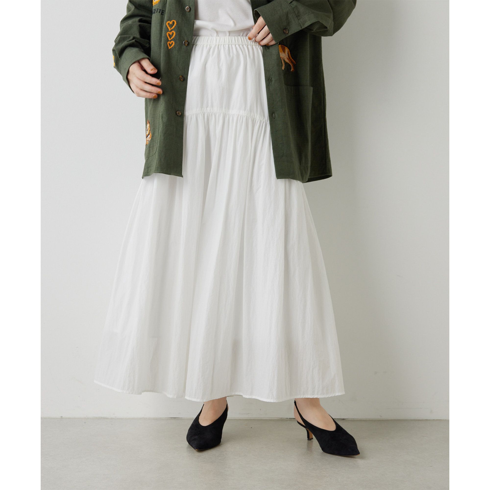 【追加生産商品】シーズンレスに着回せる、大人のギャザースカート■たっぷりとしたギャザーで分量をとった切り替えデザインスカート。■ナチュラルな表情感と非常に軽いのが特徴のタフタ素材を使用した一着。■裏地は清涼感のある通気性の良い生地を使用し、見た目も着心地も軽やかに。■ウエストはリラクシングな総ゴム仕様で、さらに内紐付きのためサイズ感を調整可能。■広がりすぎない上品なシルエットで甘い印象になりすぎず、大人の女性らしく着こなせるアイテム。【COLOR】オフホワイト:可憐な華やぎを添える、清潔感のあるホワイト。ブラック:さりげない光沢が表情をプラスするブラック。ブラウン:レザーのような雰囲気のあるシックなブラウン。【MATERIAL】リサイクルナイロン糸を使用したナチュラルビンテージ仕上げのタフタ素材。----------------------------------------------------洗濯方法:手洗い可透け感:なし裏地:あり伸縮性:なし光沢感:ややあり----------------------------------------------------【注意事項】・画像の商品はサンプルです。実際の商品と仕様、加工が若干異なる場合があります。また 、パソコンやスマートフォンのモニター環境などにより、色味が違って見える場合がございます。・店頭及び屋外での撮影画像は、光の当たり具合で色味が違って見える場合があります。商品の色味は、スタジオ撮影の画像をご参照ください。・入荷状況により、お届け予定が前後する場合があります。・お客様への発送が店頭販売より遅れる場合があります。・追加生産商品は、一部の店舗、通販で販売中の場合があります。予めご了承下さい。