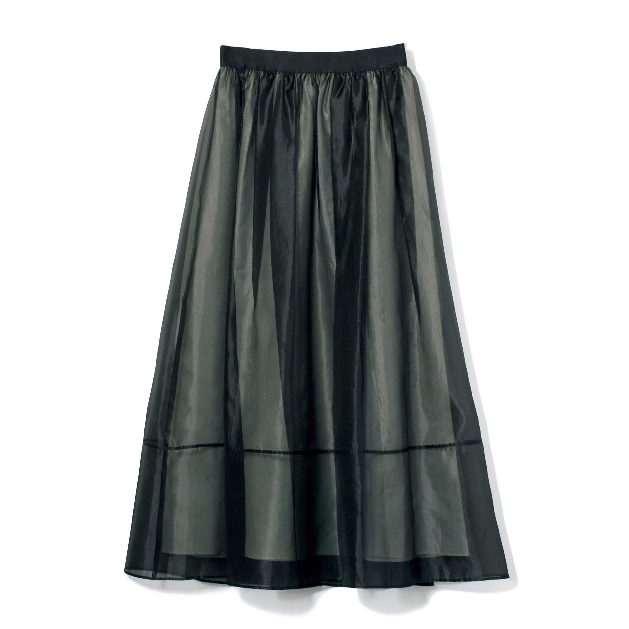 歩くたびに揺れるシルエットとほんのりとした透け感で、主役級のドラマティックさが魅力。たっぷりとした生地量ながら、広がりを抑えることで見た目はすっきり。裏地のスカートはしなやかなタフタ生地で、足さばきもスムーズで快適に。ウエストは細かいタック入りで、トップスをインしても隙なく美しい。薄着の季節の華やかスタイルに欠かせない!