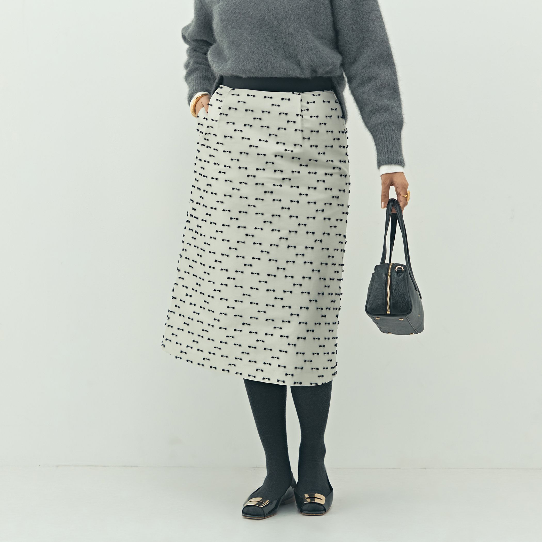 ◇25AW◇NOLLEYS◆Point・リボンジャガードが大人可愛いAラインスカート・群馬県の桐生のジャガードを使用したKIRYUシリーズ・手作業で丁寧にカットされたリボンがランダムに施されたデザイン・程よいハリ感のあるタフタ素材で、きれいなシルエットをキープ・しなやかな柔らかさと軽さが特徴で、手洗いしても型崩れせず、シワになりにくい素材・ウエストゴムで締め付け感のない穿き心地・セレモニーやお食事会などに活躍する上品で華やかなアイテム・生地から縫製までmade in japan・同素材のブラウス(5-0035-6-01-005)とセットアップ着用も可能・同素材テーパードパンツ(5-0035-6-09-005)●お取扱い上のご注意●末永くご愛用頂くために、アテンションタグを必ずご確認の上、着用又はお取り扱い下さい。気になる商品は、お気に入り登録がオススメです!クーポン情報、入荷情報が、通知されるようになります。※手洗い可※店頭及び屋外での撮影画像は、光の当たり具合で色味が違って見える場合があります。商品の色味は、スタジオ撮影の画像をご参照下さい。※商品画像に関しては出来る限り忠実に表示出来るよう努めておりますが、お客様がご利用のモニターの設定及び特性により、実際の商品と比較し色味に若干の誤差が生じる場合があります。※画像の商品はサンプルとなりますので実際の商品と仕様、加工、サイズが若干異なる場合がございます。