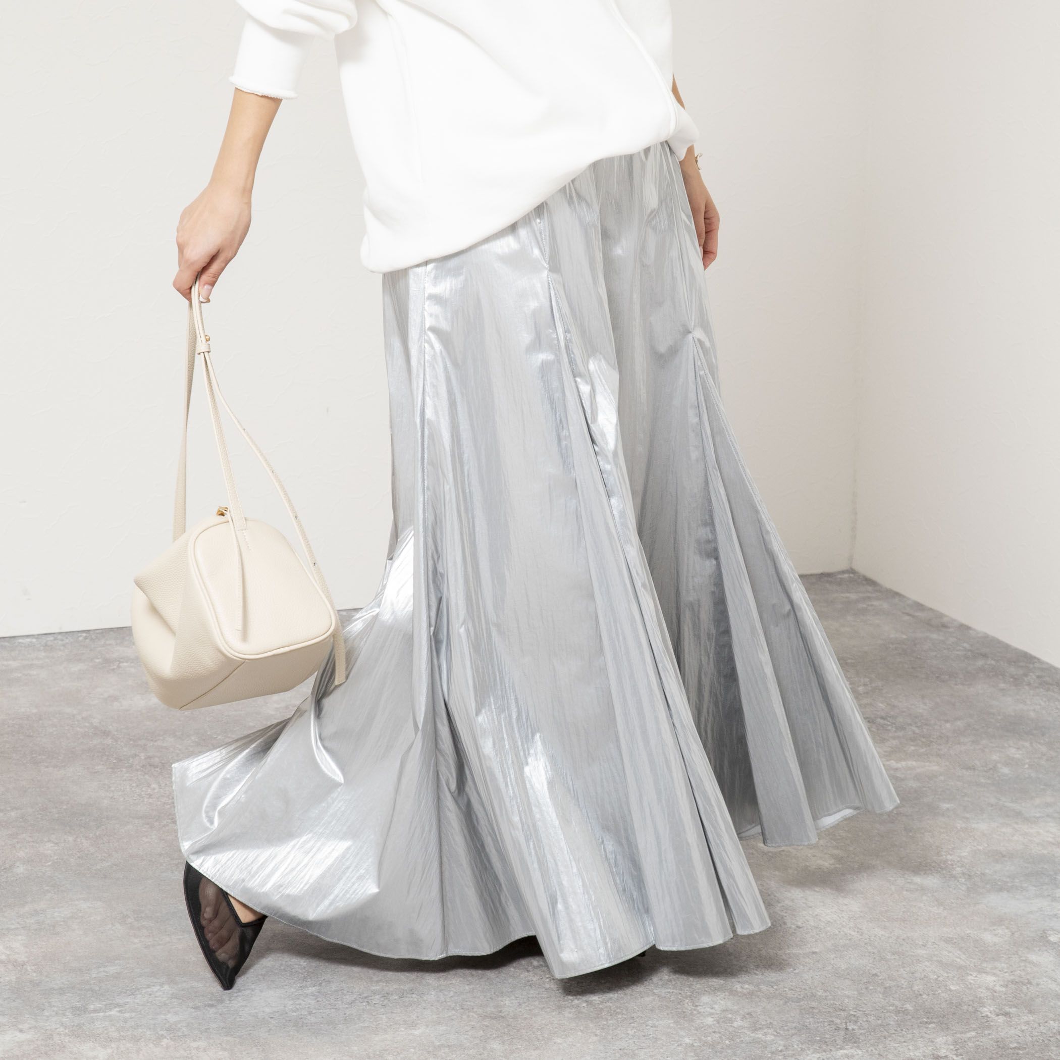 ◇26SS◇2nd NOLLEYS◆Point・45周年を記念し、ブランドを象徴する人気アイテム「マチ入りマキシスカート」をスペシャル素材で仕上げた一枚・イタリア・プラトーの LEATHERTEX社によるPUコーティングテキスタイルを採用・レザーのような上質感と、ナイロンならではの軽さを兼ね備えたスカート・シルバーとゴールドの2色展開・ウエストはドロスト+ゴム仕様でストレスフリー・生地を8枚接ぎ合わせ、さらに4箇所にマチを入れたこだわりのパターンで、ウエストまわりはすっきり見せながら裾に向かって美しくボリュームが広がるシルエット・歩くたびに裾が揺れ、ドラマティックに映える一枚・シンプルなトップス合わせでもスタイリングが決まり、シーズンレスで活躍するスカート・帯電防止裏地付き・手洗い可●お取扱い上のご注意●末永くご愛用頂くために、アテンションタグを必ずご確認の上、着用又はお取り扱い下さい。気になる商品は、お気に入り登録がオススメです!クーポン情報、入荷情報が、通知されるようになります。※店頭及び屋外での撮影画像は、光の当たり具合で色味が違って見える場合があります。商品の色味は、スタジオ撮影の画像をご参照下さい。※商品画像に関しては出来る限り忠実に表示出来るよう努めておりますが、お客様がご利用のモニターの設定及び特性により、実際の商品と比較し色味に若干の誤差が生じる場合があります。※画像の商品はサンプルとなりますので実際の商品と仕様、加工、サイズが若干異なる場合がございます。