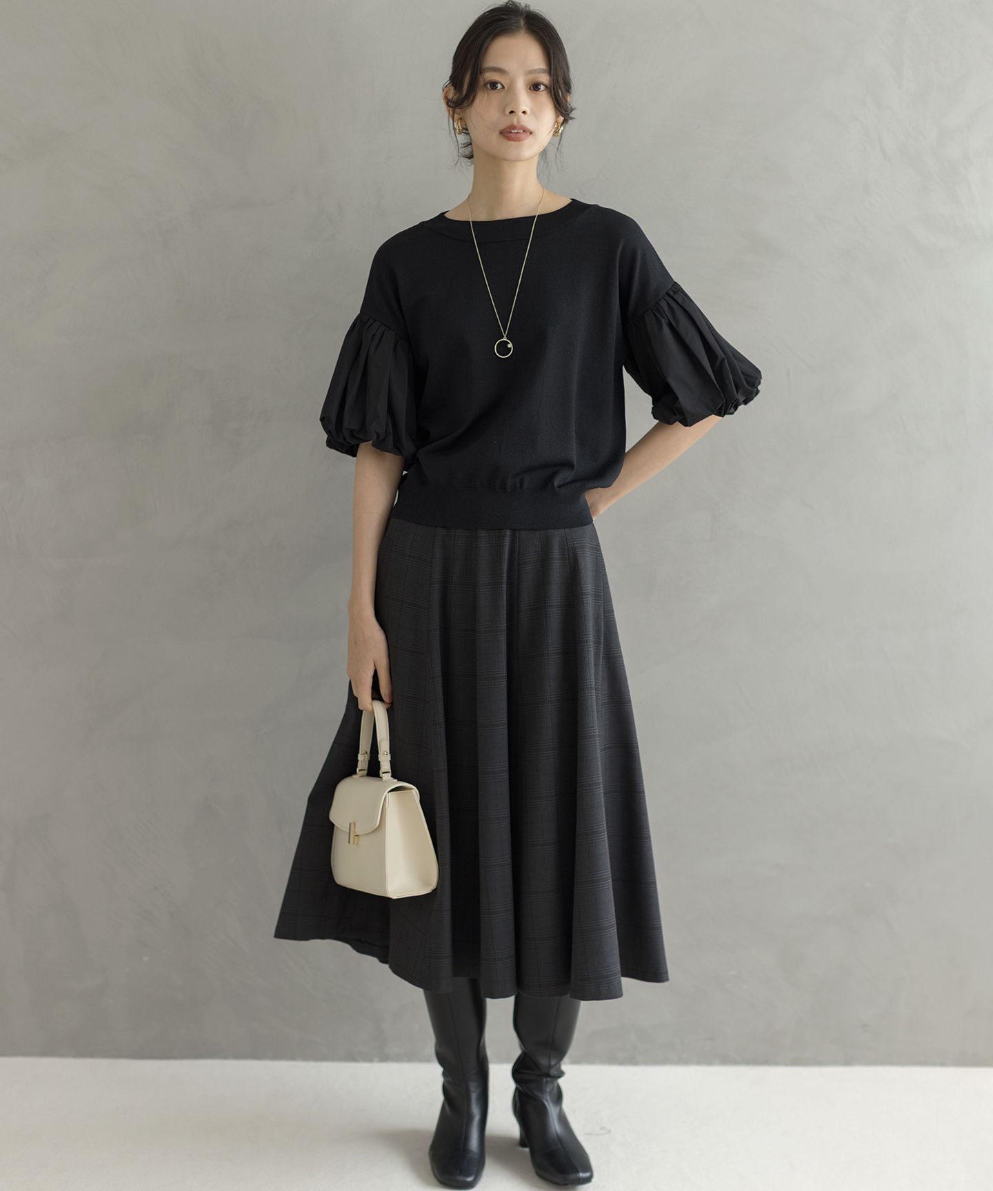 イージーなはき心地が嬉しい上品な美シルエットスカート■デザイン・ウエストをすっきりと見せながら裾にかけてのフレアの広がりが美しいスカート。動くたびにゆれるフレア感が素敵です。・タテのラインを強調する切り替えに、パーツごとに分量を入れた立体的なパターンがポイントです。・後ろはゴム仕様で、イージーなはき心地はありながらもカジュアルに見せない分量感にこだわりました。・デイリーからお出かけシーンまで幅広く活躍し、一枚でスタイリングを華やかにしてくれます。■素材・ポリエステル/レーヨンでシワになりにくく、柔らかくストレッチ性が優れていて着心地の良い素材です。・ドレープ性に優れた素材なので、ボリュームのあるデザインに向いた素材感です。・表裏の両面微起毛加工が施してあるのでウォーム感と肌触りの良さが魅力。・チャコール系チェック3のカラーは使いやすい組曲オリジナルのチェック柄です。【スタッフコメント】▼身長158cm|着用サイズ2 (通常着用サイズM)ウエストをすっきりと見せてくれるフレアの広がりが美しいスカートです。デイリーからお出かけシーンまで、幅広く重宝すること間違いなしのアイテム。ストレスなく着用いただける後ろがゴム仕様なのもうれしいポイント!============================洗濯方法:手洗い可裏地:あり透け感:なし============================【注意事項】※撮影時の照明の関係により、色味が若干異なって見える場合がございます。商品の色味はハンガー吊り画像をご参照ください。※画像はサンプルを使用しているため、実際にお届けする商品と色味やサイズ等の仕様に変更がある場合がございます。▼気になるアイテムは『お気に入り登録』がおすすめ▼お好きなカラー&サイズを選んで?マークをクリック!再入荷通知や、ラスト1点の通知、セールの通知も受け取ることができます。