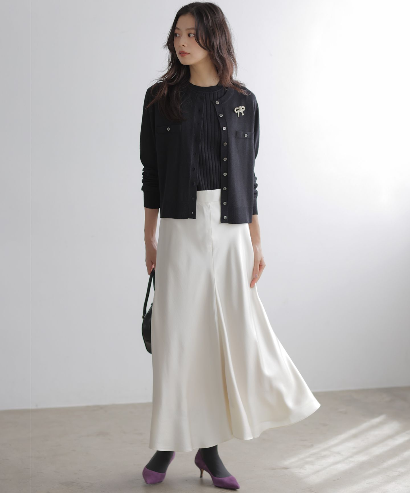 大人エレガンスを得意とする組曲と人気女性誌Oggiとのコラボ企画!さまざまなシーンで着回せる万能さ、ニットと組み合わせるだけで今っぽい着こなしが叶う流行のラメ素材を、大人のワードローブに合わせやすいニットスカートに落とし込みました。■デザインPOINT1:大人っぽく着られるほのかなラメ感POINT2:ボディラインを拾いにくいほどよい肉厚感POINT3:裾後ろスリット入りで歩きやすさも抜群!繊細なラメ糸をいれたトレンド感あるデザインのニットスカートは体のラインを拾いすぎない肉感で、ウエストはゴム入りでほどよくフィット。すっきりとしたIラインシルエットでボリュームのあるトップスとも好バランス!エレガントに仕上がるスカートの絶妙な丈感も試行錯誤したポイントです。裾後ろはスリット入りで足さばきもよく、ロングブーツにもパンプスにも合わせやすいデザインに仕上げました。通勤スタイルからホリデーシーズンのお出かけまで、華やぎ感をプラスしたいシーンに最適なスカートはこの冬のワードローブに欠かせない一枚です。ラメ感を一番感じる華やかなブラック、大人シックなモカ、クリーンなホワイトの3色展開です。■素材綿と肌触りの良いアクリル混紡糸に細くてストレッチ性の強いポリエステル糸を加えることにより、伸縮性と強度をプラスした素材です。大人の女性がデイリーに使いやすい繊細な輝き感のラメ糸を使用、はき心地と華やかさを両立しました。■雑誌掲載【2024/10/28発売】Oggi12月号掲載※撮影時の照明の関係により、色味が若干異なって見える場合がございます。実際にお届けする商品の色味はハンガー吊り画像をご参照ください。※画像はサンプルを使用しているため、実際にお届けする商品と色味やサイズ等の仕様に変更がある場合がございます。予めご了承ください。【お買い物をより楽しんで頂くために】▼商品のお気に入り登録ハートマークをクリックし、お好きなカラーを選んでお気に入りに登録が完了!完売カラーの再入荷通知や、ラスト1点の通知、セールの通知も受け取ることができます。▼ブランドのお気に入り登録新商品や再入荷等、いち早くブランドのお得な情報を受け取ることができます。
