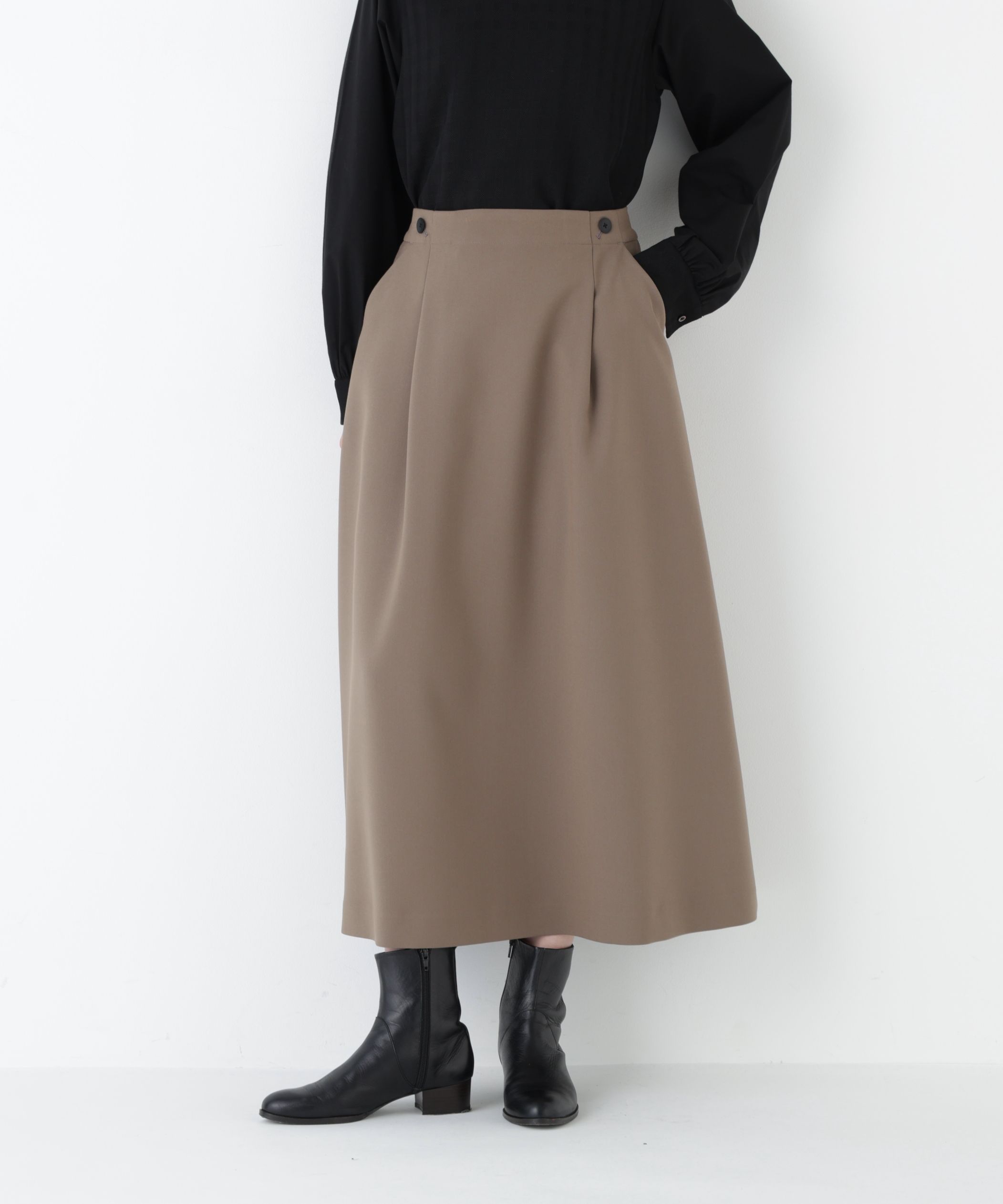 マリン風ディテールがアクセントのフレアスカート【デザインのポイント】飾り釦を使用したマリン風ディテールがポイントのワンタックセミフレアースカートです。【素材のポイント】厚すぎない程よい肉感と反発感のある二重織ストレッチ素材を使用しています。ご自宅での手洗いも可能です。【おすすめコーディネート】シンプルなトップスを合わせても品良く仕上げてくれる一枚です。足元を選ばずブーツ合わせなどもお似合いな丈感です。透け感/なし|裏地/あり|光沢/なし|生地の厚さ/普通|伸縮性/なし|シルエット/スタンダード