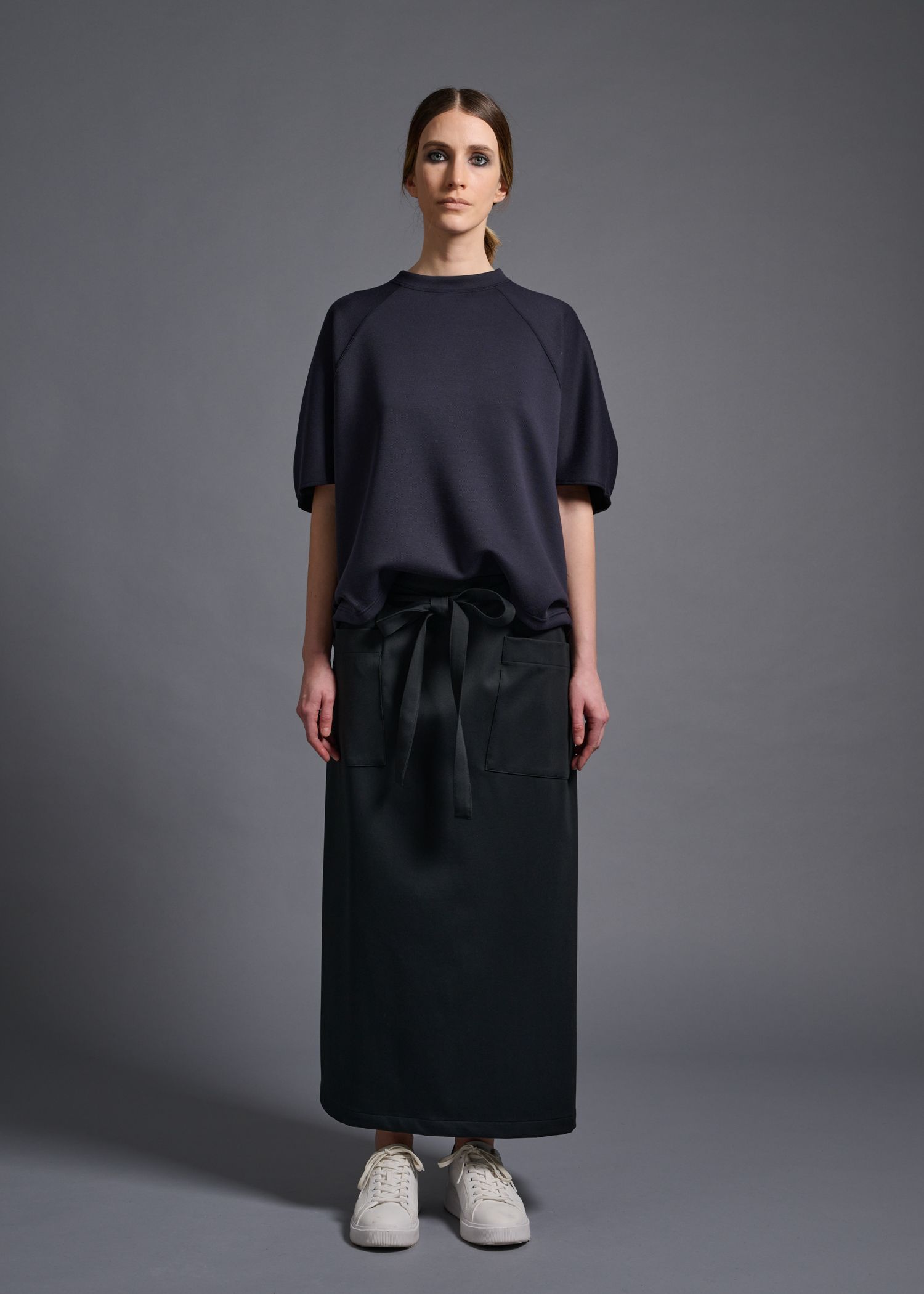肩の切り替え位置やゆとりのある五分袖など、ディテールを工夫することでトレンドのビッグシルエットを大人が着やすく。裾のワイドリブでトップスアウトがおしゃれ見え。改まった席に重宝するネイビーもあり。ドライタッチな表面感で着心地もいい。
