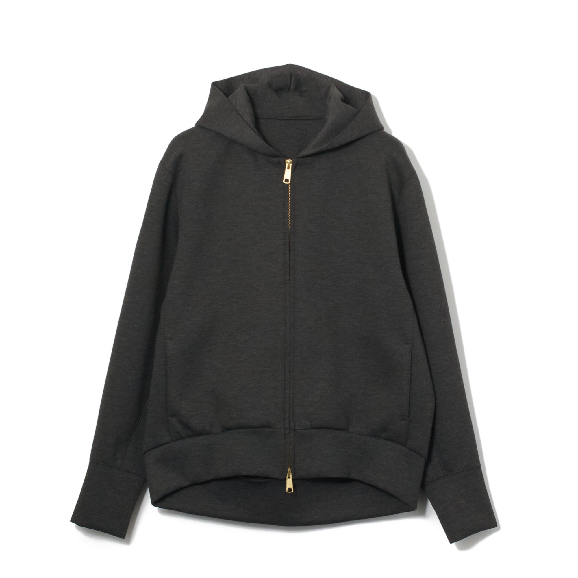 肩の部分を落として身幅に適度なゆとりをもたせることで、抜け感を醸し出す立体的なフォルムに更新。ほどよく厚みのあるダンボールニットはスウェットよりも軽量で、張りや光沢があるのが特徴。ゴールドのダブルジップがスポーティなパーカにエレガントなムードを上乗せ。
